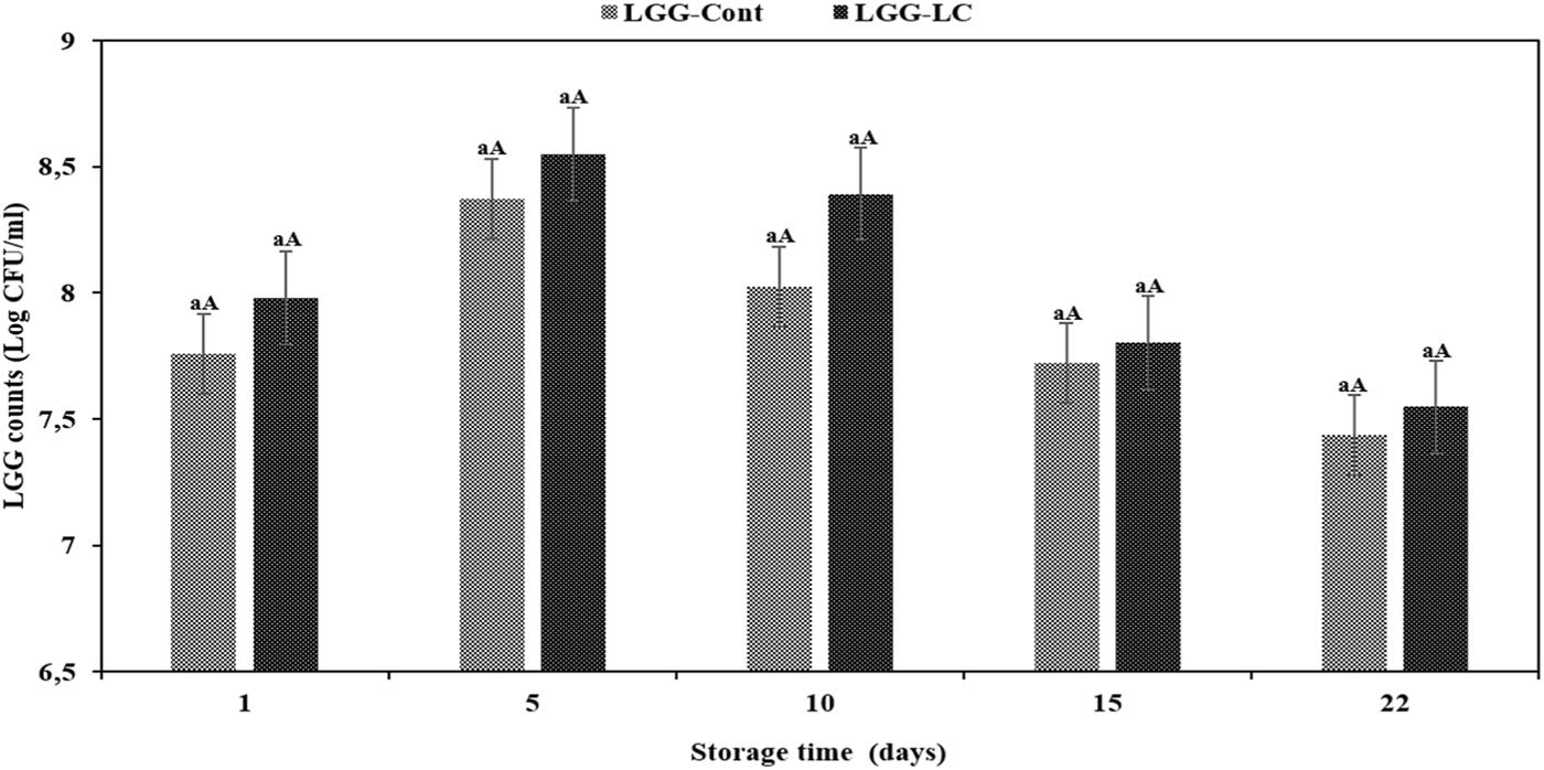 The survival of LGG bacteria in fermented dairy products has already been reported (Mitra and Ghosh, 2019; Yousefvand et al., 2022). Despite the health benefits proposed for probiotic-enriched dairy products, the primary challenge is maintaining the survival rate and viability of probiotic bacteria above the critical threshold throughout cold storage and in the gut environment, which means that dairy products marketed as fermented probiotics should contain at least 107 cfu/ml of viable probiotic cells (Innocente et al., 2016; Fazilah et al., 2018).