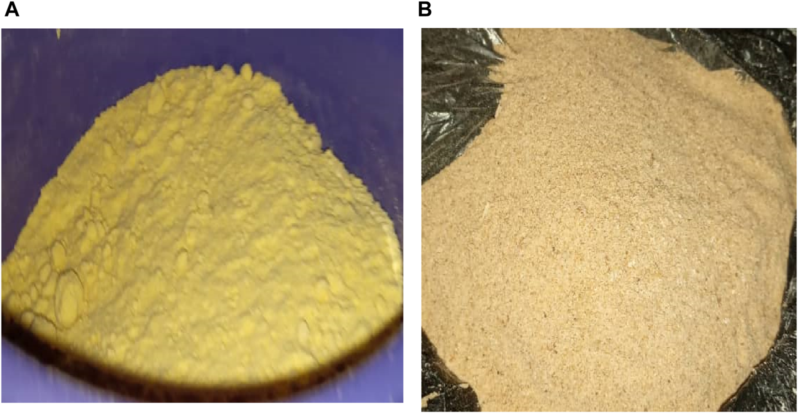 Flour samples. (A) Biofortified yellow maize flour, (B) Brachystegia eurycoma flour.