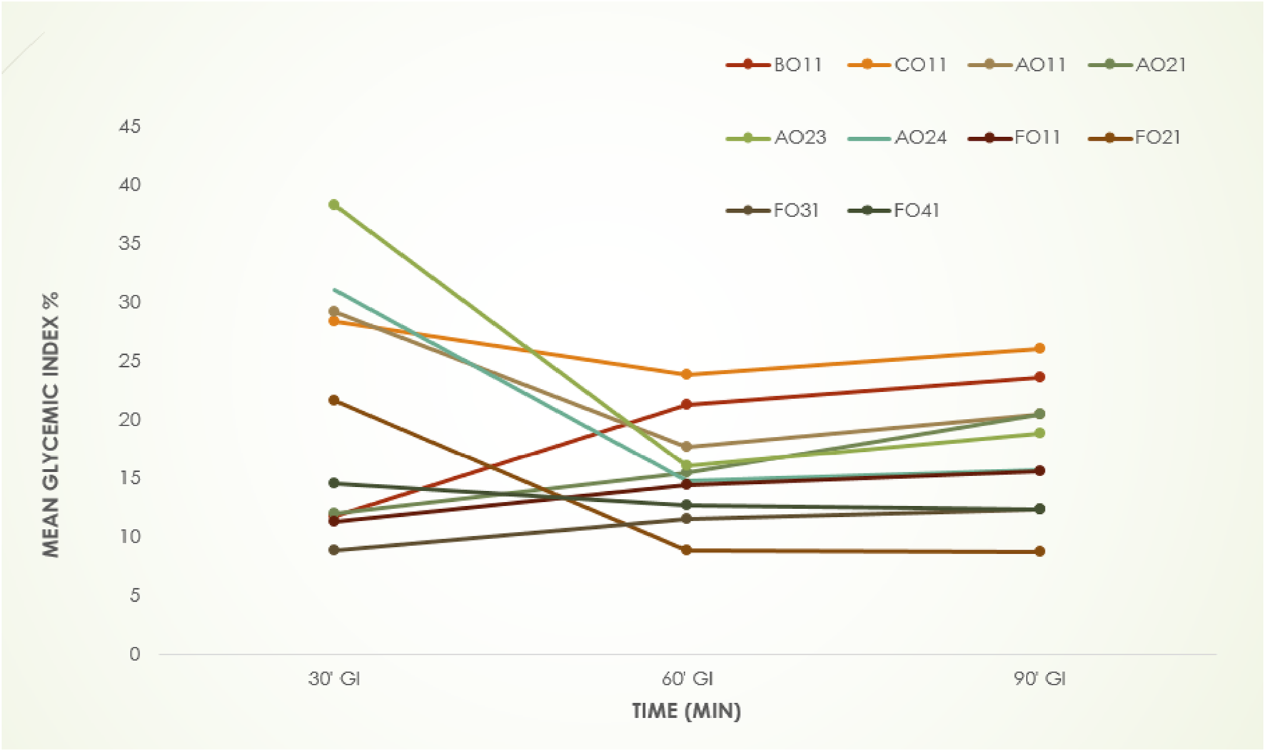 Glycemic index (GI) of the Cookies Keys: BO11 = 100%BYF, C011 = 100%WF, AO11 = 2.5%BEF-97.5%BYF, AO21 = 5%BEF-95%BYF, AO23 = 7.5%BEF-92.5%BYF, AO24 = 10%BEF-90%BYF, FO11 = 2.5%SCMC-97.5%BYF, FO21 = 5%SCMC-95%BYF, FO31 = 7.5%SCMC-92.5%BYF, FO41 = 10%SCMC-90% BYF CWF, commercial wheat flour, BYM, biofortified yellow maize flour; BEF, Brachystegia eurycoma flour, SCMC, sodium carboxymethyl cellulose.
