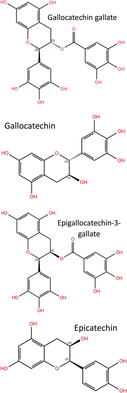 Catechins are the primary polyphenols in tea and comprise gallocatechins, gallocatechin gallate, epigallocatechin-3-gallate (EGCG), epicatechin-3-gallate, and epicatechin (Figure 2). However, EGCG is the most extensively researched catechin of green tea (Khan and Mukhtar, 2018). The active food packaging films prepared using tea polyphenols are mostly sourced commercially as high-purity tea polyphenols (Supplementary Table S1). The active packaging films/pads prepared using tea polyphenols have improved properties, such as UV-barrier property, water-vapor barrier property, tensile strength, surface hydrophobicity, roughness, and gas-barrier property. Nonetheless, some properties of the polyphenol-based active packaging films are diminished, such as the elongation at break, water vapor permeability (WVP), swelling degree, and optical transmittance (Supplementary Table S2). Solution casting is the most widely used method to prepare polyphenol-based active packaging films; however, electrospinning, temperature-assisted electrospinning, and ultrasound-assisted solution casting methods are also reported for the preparation of tea-polyphenol-based active films (Supplementary Table S3). The antioxidant properties of these polyphenol-based active packaging films have been evaluated using ABTS, DPPH, and FRAP assays, whereas the ager disk diffusion assay and CFU count of viable microorganisms have been used to assess the antimicrobial properties. Furthermore, food-infection-associated microorganisms have been used for such antimicrobial tests (Supplementary Table S3), such as Listeria monocytogenes (NCTC 7973) and Escherichia coli (NCTC 9001); Staphylococcus aureus (ATCC 29215) and E. coli (ATCC 25922); S. aureus (ATCC 6538), E. coli (PTCC 1330), and Staphylococcus aurous (PTCC 1112) (Siripatrawan and Harte, 2010; Ashrafi et al., 2018; Chenwei et al., 2018; Biao et al., 2019; Chen et al., 2019; Wu et al., 2019; Yuan et al., 2020; Yang et al., 2021; Zhang et al., 2021; Miao et al., 2022; Zhou et al., 2022). Lastly, it has been recognized that the catechins from green tea possess antioxidant, anticancer, and cardiovascular disease preventive properties (Mandel et al., 2006; Tsai and Chen, 2016).
