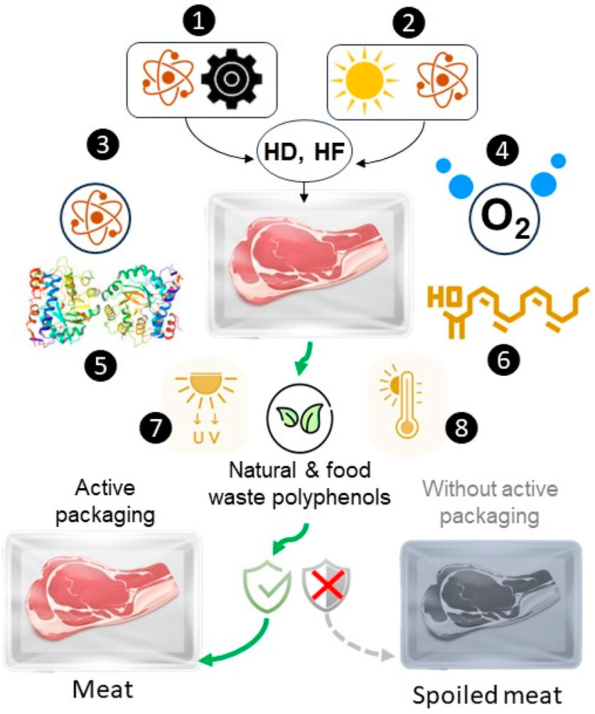 Figure 3. Oxidative deterioration of packed foods and the protective roles of polyphenol-based antioxidant packaging: (1) autoxidation; (2) photo-oxidation; (3) antioxidant availability; (4) oxygen availability; (5) enzymatic oxidation (e.g., 5ZBM); (6) fatty acid composition; (7) ultraviolet light barrier property; (8) storage temperature. HD; hydroperoxide decomposition, HF; hydroperoxide formation.