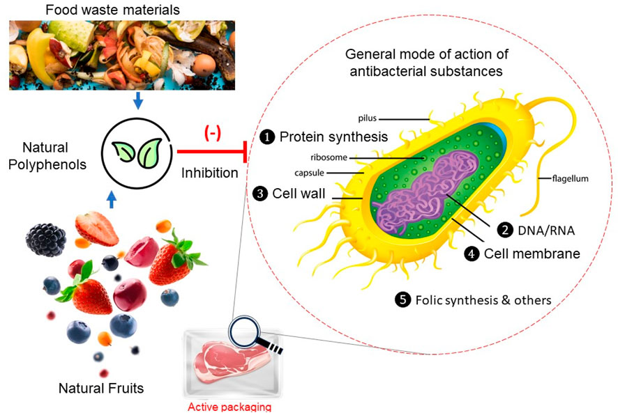 Figure 4. Natural and food-waste-based antimicrobial active packaging: (1) inhibition of protein synthesis; (2) nucleic acid synthesis; (3) interference with cell wall synthesis; (4) interference with cell membrane synthesis; (5) impeding folic acid synthesis and other mechanisms.