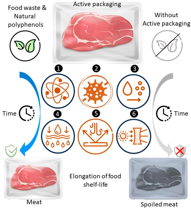 Figure 6. Extension of the shelf lives of food products using natural and food-waste polyphenols: (1) antioxidant property; (2) added antimicrobial property; (3) slow release of polyphenols; (4) improved water vapor permeability; (5) improved gas barrier property; (6) improved light barrier property.