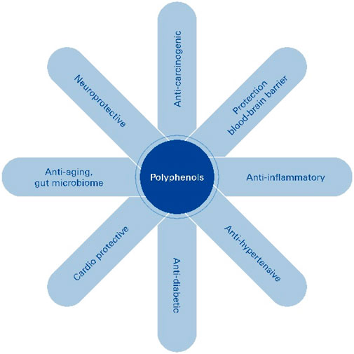 The polyphenols found in fruits and plants are considered highly important functional foods. Thus, the use of polyphenols from fruit and food wastes may also have health-promoting properties alongside sustainability. To date, several in vitro and in vivo studies have been conducted to evaluate the effects of these chemicals on health (Agarwal et al., 2013; Afrin et al., 2016; Rana et al., 2022). Herein, we describe the anti-inflammatory, antihypertensive, and antidiabetic actions of polyphenols as well as their antioxidant and anticytotoxic capacities based on experimental evidence (Figure 7). Research has shown that polyphenols serve important roles in protecting the body from external stimuli and eliminating reactive oxygen species, which are responsible for several illnesses (Abolaji et al., 2018). Tea, chocolate, fruits, and vegetables contain polyphenols, which have the potential to boost the health of the human cardiovascular system positively. For example, the flavan-3-ols of cocoa have been associated with decreased risk of myocardial infarction, stroke, and type 2 diabetes in both animal and human studies. Additionally, resveratrol as a flavonoid and stilbene has been linked to a healthier heart (Abolaji et al., 2018; Lüscher, 2021). In addition to improving blood pressure, lipid profile, and insulin resistance, diets high in polyphenols can also lower cholesterol levels. Polyphenols from dietary sources may exert therapeutic effects on the gut microbiome through multifactorial characteristics. There is an increasing body of evidence on how the human gut microbiome intercedes feedback between our diet and health; the gut microbiome is also an important mediator of gut and systemic inflammation (Singh et al., 2017). It is important to note that polyphenols are converted into bioactive compounds by the gut microbiome. Expanding on this point, research on aging and longevity support the notion that the gut microbiome is at the core of many age-related disorders, including immune system dysregulation and susceptibility to major diseases (Badal et al., 2020). Recent studies have suggested that the intestinal microbiome has vital influence on modulating susceptibility to several chronic and common diseases, including inflammatory bowel disease, obesity, type 2 diabetes, cardiovascular diseases, and cancer.