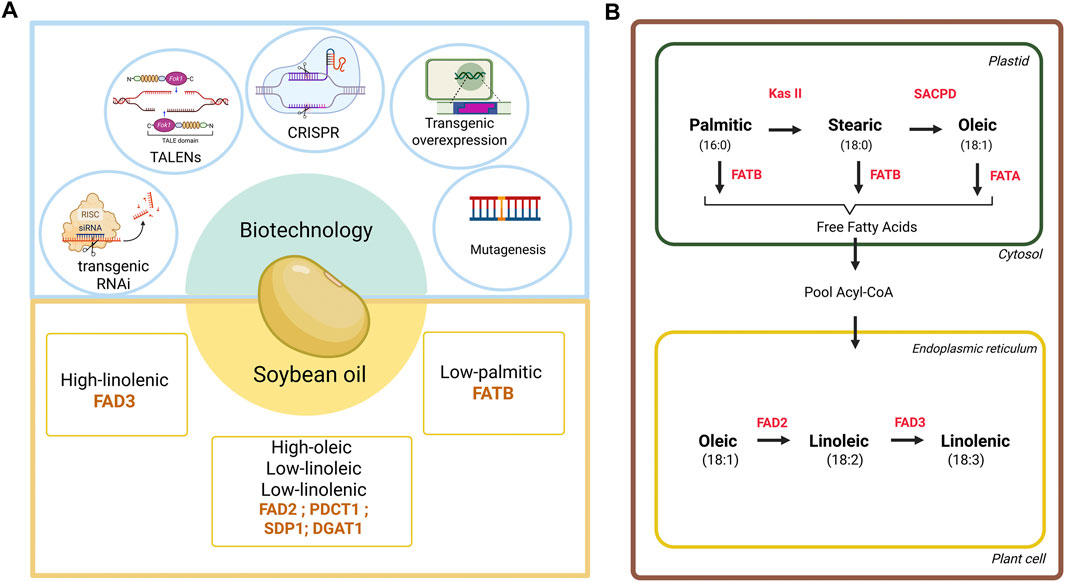 Figure 1. Biotechnological tools and metabolic pathways involved in fatty acid biosynthesis in soybean. (A) Schematic representation of biotechnological tools used to improve soybean oil profile, including transgenic RNA interference (RNAi), transcription activator-like effector nucleases (TALENs), CRISPR/Cas9, transgenic overexpression, and mutagenesis. These tools have been applied to regulate genes such as FAD2, FAD3, FATB, PDCT1, and SDP1, aiming to increase oleic acid content and reduce levels of saturated (palmitic) and polyunsaturated (linoleic, linolenic) fatty acids. (B) Fatty acid biosynthesis pathway in plant cells. In plastids, palmitic acid (16:0) is elongated to stearic (18:0) by KAS II, and subsequently SACPD the convertion to oleic acid (18:1). In endoplasmic reticulum, oleic acid can be desaturated linoleic (18:2) and linolenic acid (18:3) via FAD2 and FAD3, respectively. Genes: KAS II, 3-ketoacyl-ACP synthase II; SACPD, stearoyl-ACP desaturase; FATA/FATB, acyl-ACP thioesterases A/B; FAD2/FAD3, fatty acid desaturases 2/3. Created with BioRender.com.