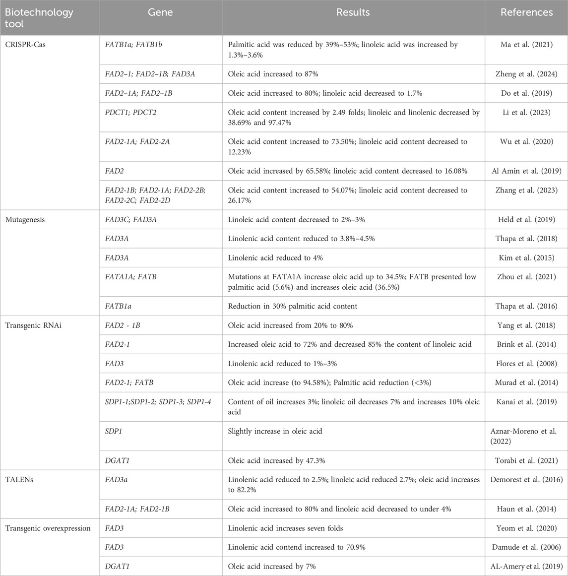 More recently, the CRISPR/Cas9 tool has been used to edit genes in the FATB gene family, such as FATB1a, FATB1b, and FATA1. Knockout of FATB1a and FATB1b led to reductions in palmitic acid by up to 53% and stearic acid by up to 37%, with no significant changes in unsaturated fatty acids, although oleic acid content increased by 1%–3% (Ma et al., 2021). CRISPR-Cas9-generated mutants for the FATA1 gene showed increased oleic acid content, but plants exhibited growth defects during early developmental stages. Conversely, overexpression of FATA resulted in a 5.7% increase in fatty acid content in soybean leaves and a 26.9% and 23.2% increase in seed yield and seed fatty acid content, respectively (Liao et al., 2024).