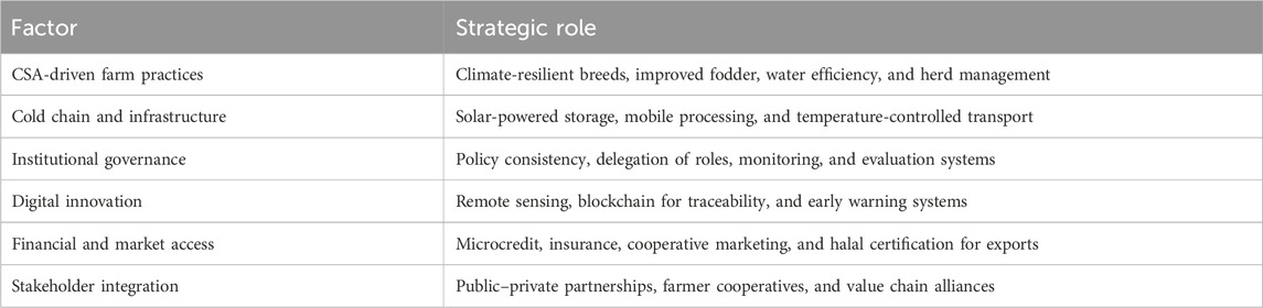 The agri-livestock sector is central to sustaining the socioeconomic fabric in the rural Pakistan, and it is a key foundation to national food security, livelihoods, and economic growth in rural Pakistan (Shahbaz et al., 2022; Sohaib and Jamil, 2017). Nevertheless, agri-livestock supply chains which encompass production and processing, distribution, and access to markets are still susceptible to a myriad of systemic issues, including climate variability, inadequate infrastructure, inconsistency in policies, and poor integration into value chains. Such difficulties disrupt productivity, which not only undermines the profitability but also poses a threat to the ability of the sector to withstand shock in the future (Azadi et al., 2022). The key elements of the proposed framework are summarized in Table 1.