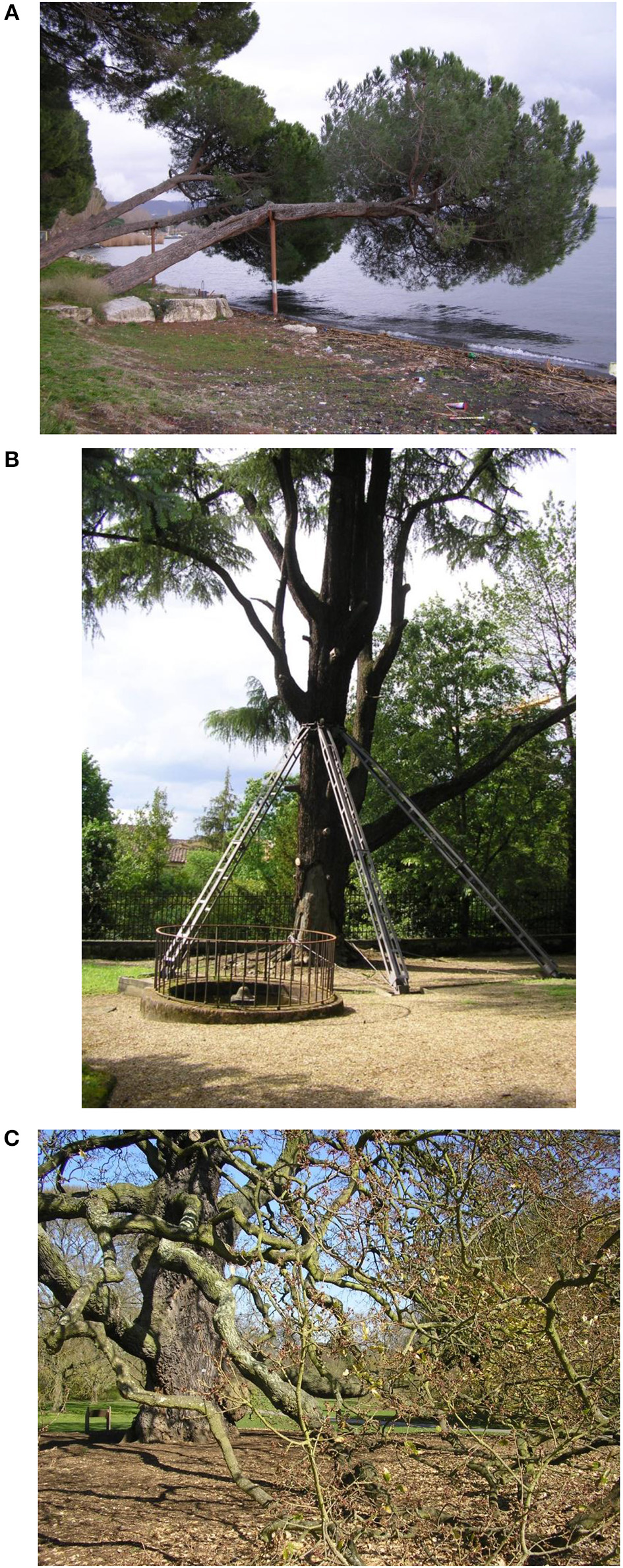 Figure 2. Examples of old trees characterizing with their presence particular places and becoming part of the place identity. (A) An extreme case of place-tree identification. In the town of Bolsena, central Italy, pine trees (Pinus pinea L.) are maintained in spite of their precarious equilibrium as “witness” of the anthropic landscape designed along the lakeshore. (B) In the historic Florentine garden “Boboli” an old Cedrus being a representative of the ancient flora of the garden itself is maintained through external protections. Whether or not such extreme example of protection is appropriate, this strategy is intended to meet citizens' and visitors' sentiment toward “patriarch” trees. (C) A “patriarch” tree (Castanea sativa Mill.) at Kew Gardens, London. All pictures by S. Fineschi.