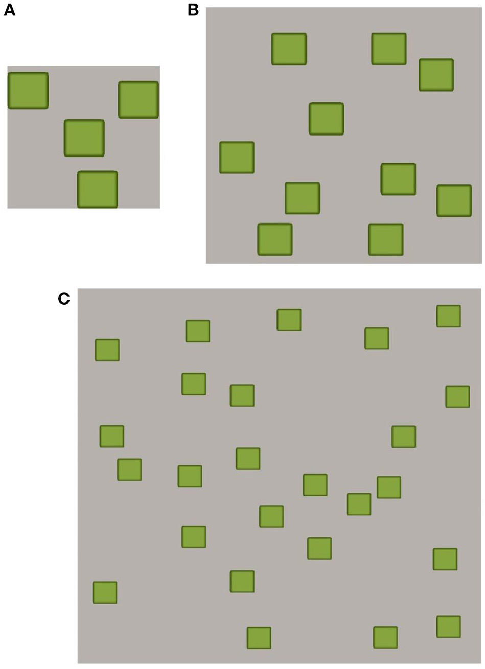 Figure 3. A schematic representation of possible fragmentation patterns of green areas (parks, garden) in expanding urban areas. Examples range from the pattern of (A), where fragmentation is limited and large green areas almost come into contact, to the pattern of (C) where, as indicated in the text, increasing fragmentation and decreasing connectivity may result in alteration or reduction of ecosystem services offered by green areas (see also Table 1). (B) Represents an intermediate pattern.