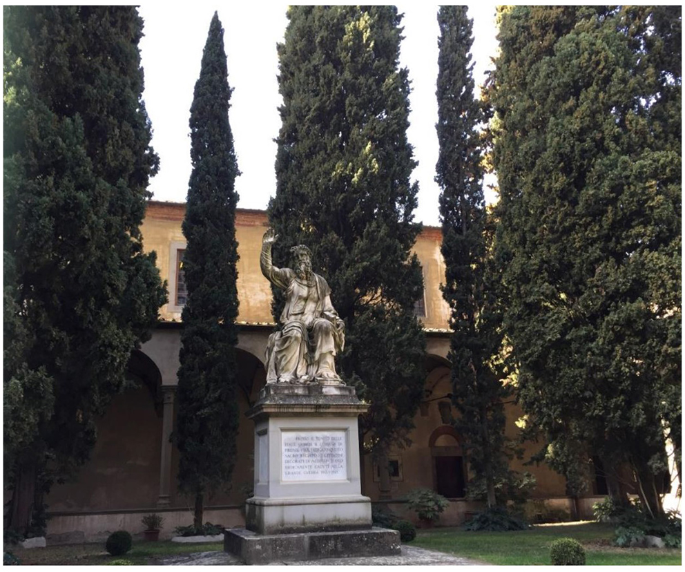 Figure 5. Cypress trees surrounding the monument to the fallen soldiers of World War I in the cloister of the Franciscan Basilica di Santa Croce (the Basilica of the Holy Cross) in Florence. Each tree is dedicated to one fallen soldier (in this case to Gold Medallists), according to the concept of “Park of Remembrance.” Picture by S. Fineschi.