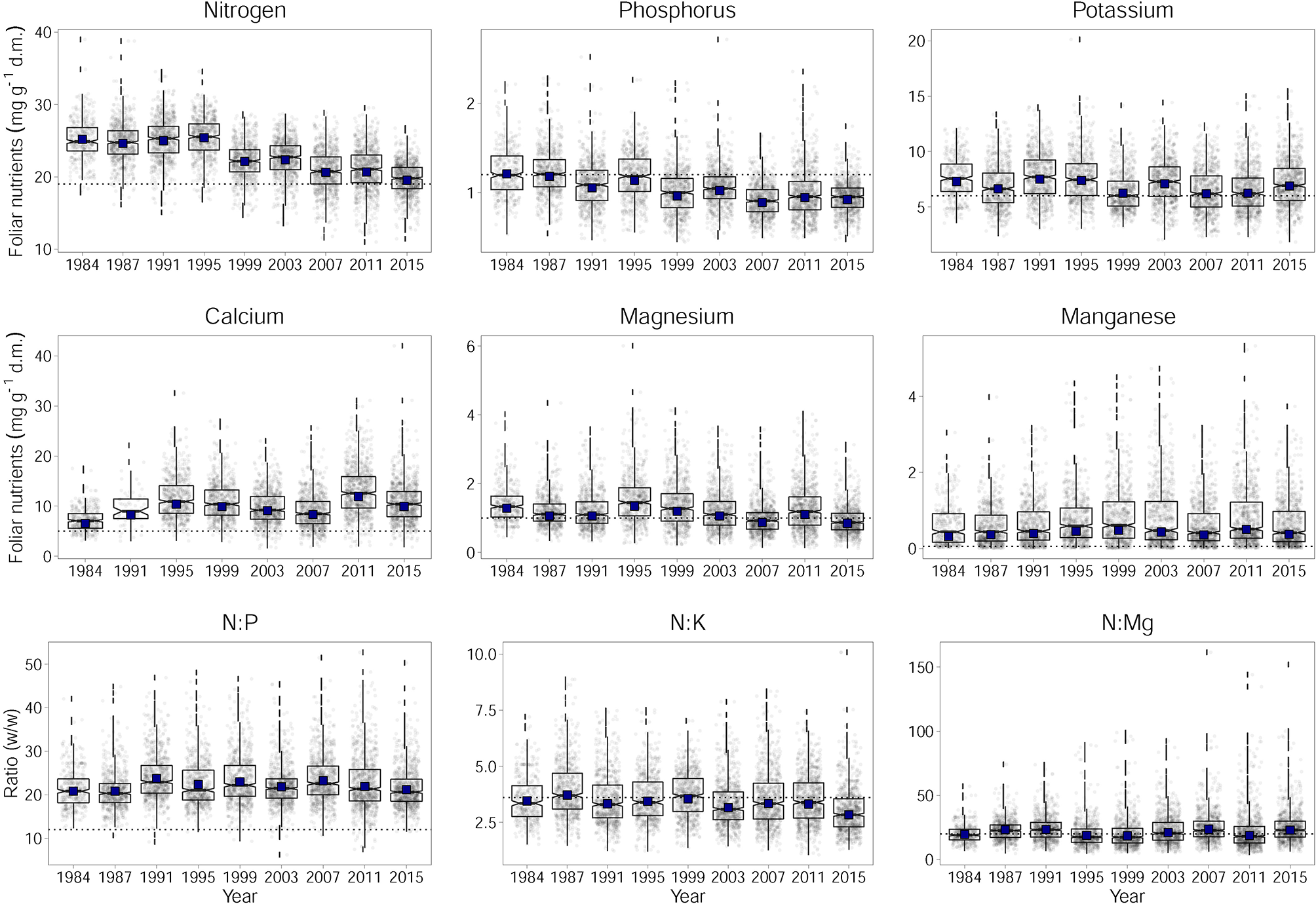 Development of foliar nutrient concentrations of N, P, K, Ca, Mg, and Mn for Fagus sylvatica per dry matter (d.m.) and the ratios of N to P, K, and Mg. Horizontal dashed lines indicates lower limits of normal ranges according to Göttlein (2015) and the upper limits of normal ranges for the ratios according to Flückiger and Braun (2003). Adjusted annual levels for the annually changing set of plots (by considering plot as a random effect) with year as fixed effect are given as black squares.