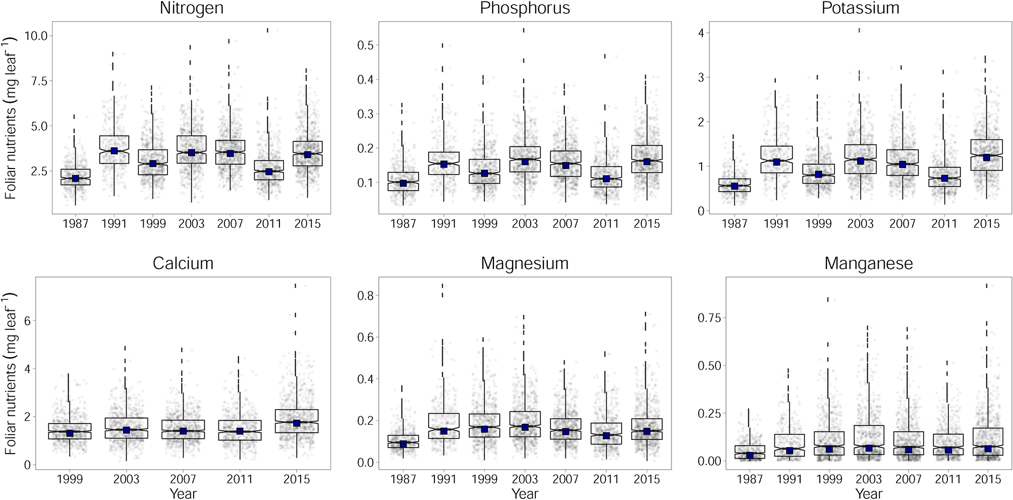 Development of foliar contents for N, P, K, Ca, Mg, and Mn for Fagus sylvatica calculated per leaf. Adjusted annual levels for the annually changing set of plots (by considering plot as a random effect) with year as fixed effect are given as black squares. The development is different when foliar contents are looked at instead of foliar concentrations (Figure 2). This contrasting development of concentrations and contents is mainly due to increasing leaf dry weight (Figure_Supplementary 4): while the specific leaf area slightly decreased throughout the observation period, leaf area increased (data not shown).