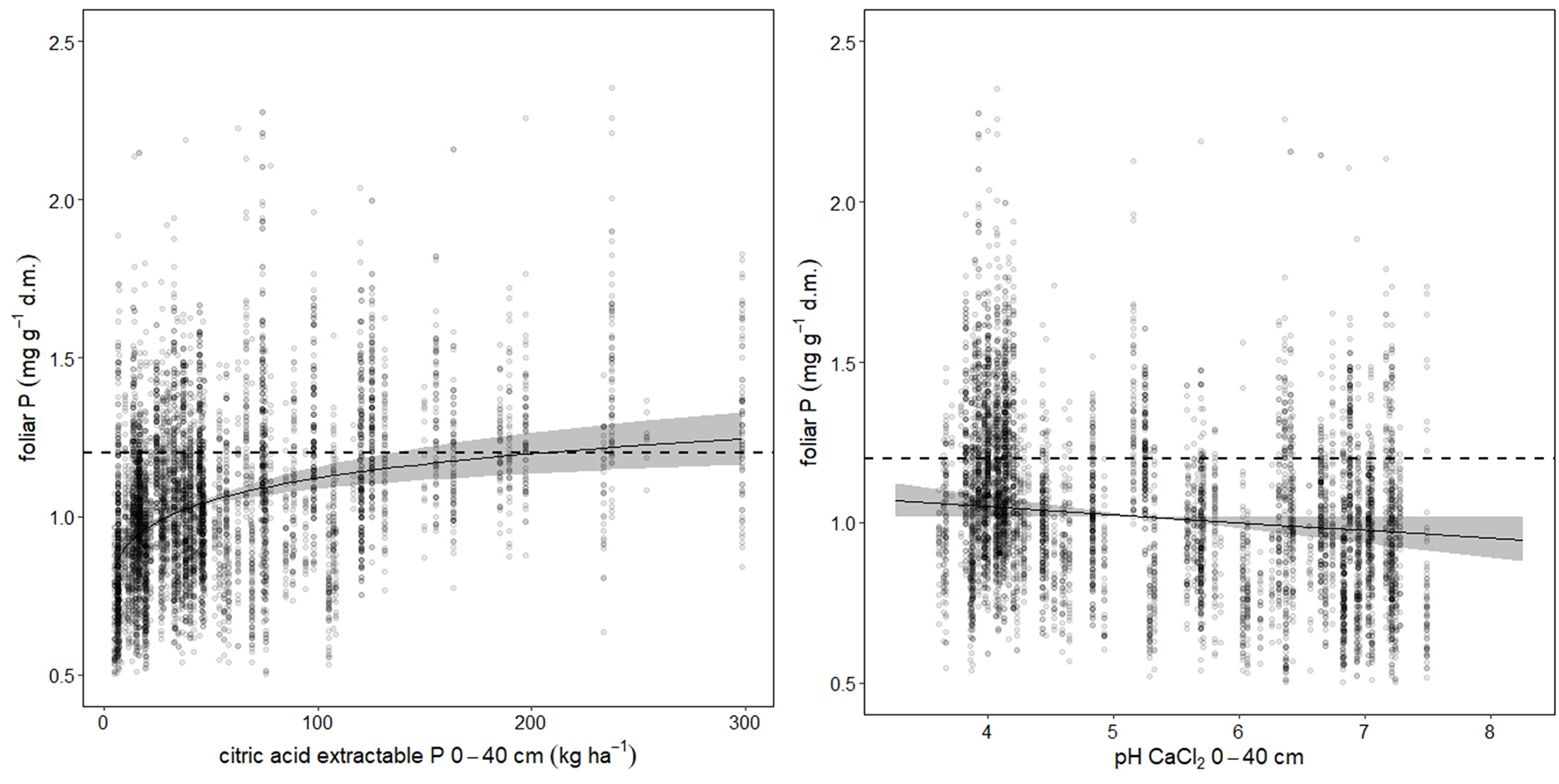 Soil chemistry predictors for foliar P. The dotted lines indicate the lower threshold of normal nutrition according to Göttlein (2015), the gray bands the 95% confidence intervals. Total variance explained is 60.9%, while citric acid extractable P (left graph) accounted for 41.5%, and pH (right graph) for 31.6%.