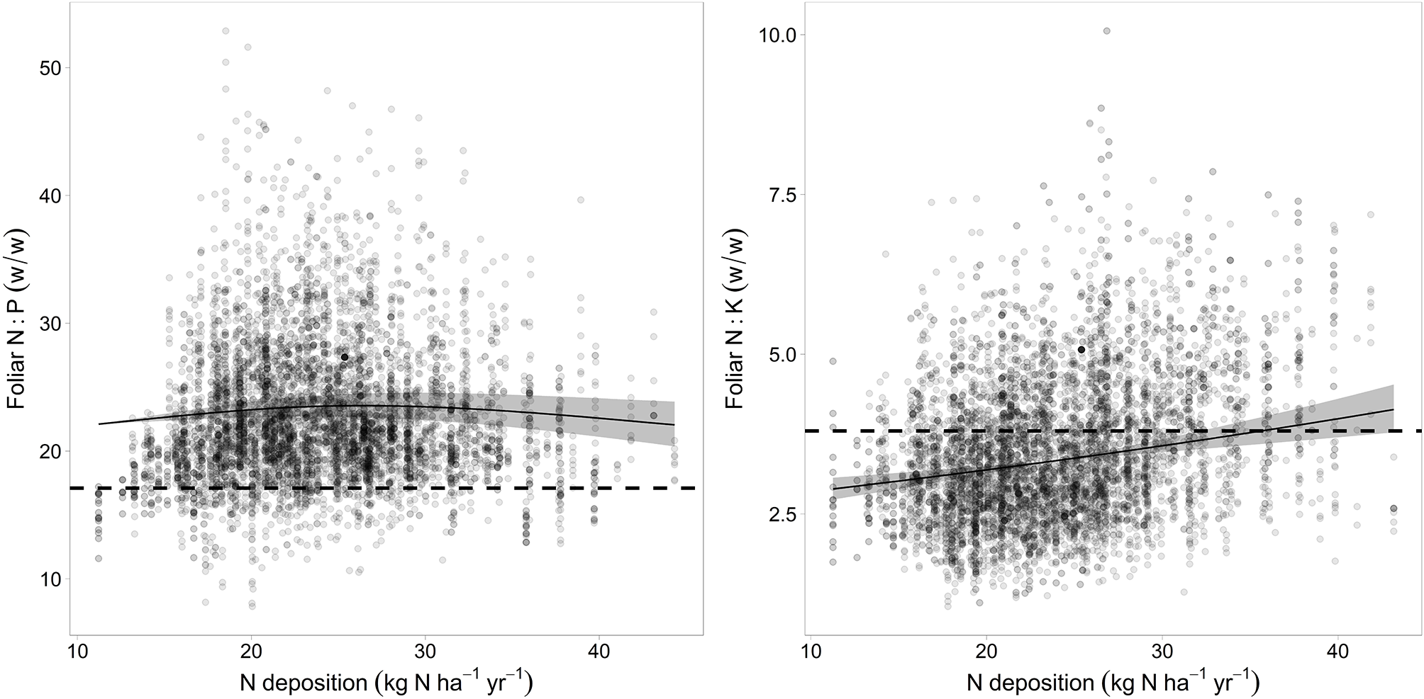 In permanent forest monitoring plots in Switzerland, decreases in foliar N and P concentrations have been observed for the last 30 years in European beech (Fagus sylvatica) (Braun et al., 2018). P concentrations have reached very low levels, far below the thresholds for normal nutrition. K and Mg concentrations have decreased, too, and leaves are showing an increasing incidence of Mg deficiency symptoms. Possible drivers for these changes may be progressive nitrogen saturation, soil acidification, changes of growth or climate or increasing tree age.