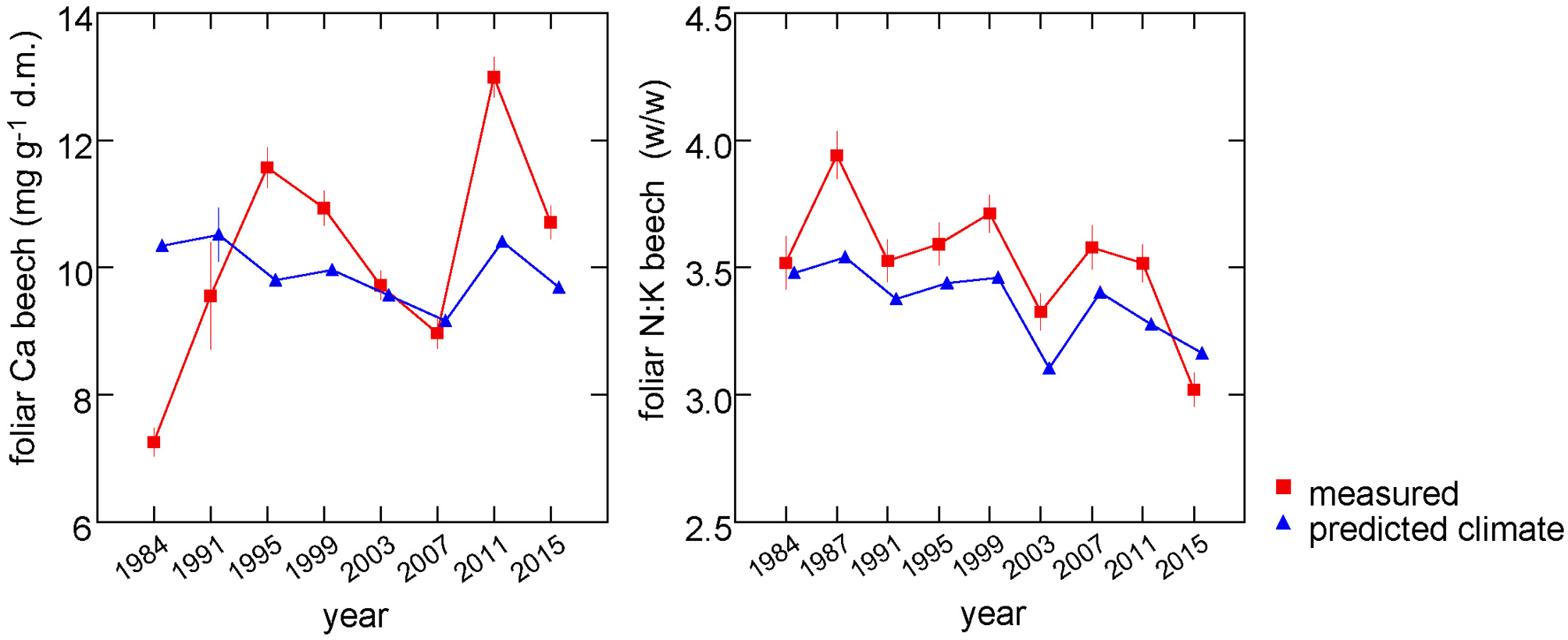 Over time, foliar concentrations of N, P, K, and Mg have decreased significantly (Figure 1). This is shown by the significance of the regression with time in Table 1. The observed time trend was not affected by the increasing number of plots as the values corrected for this do not differ from the uncorrected values (black squares in Figure 1). The increasing trend of Ca concentration in beech leaves is not significant as the variations between years are large. Inclusion of fructification reduced the variation for this element between years but the time trend remained insignificant (see Table 4). Changes of N and P concentrations were largely parallel resulting in rather constant N:P ratios. The N:K ratio have slightly decreased but this decrease is not significant as the variations from year to year are mostly explained by meteorological covariates (see also Figure 7). The time trend in Mn is not significant either.