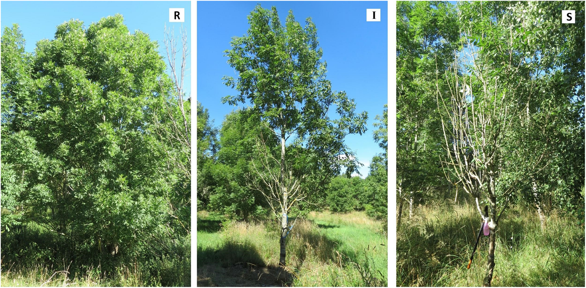 Examples of ash trees representing three susceptibility classes: Resistant (R), clone 89 at Snogeholm; Intermediate (I), clone 79 at Trolleholm; and Susceptible (S), clone 73 at Snogeholm. Photos: Marta Agostinelli.