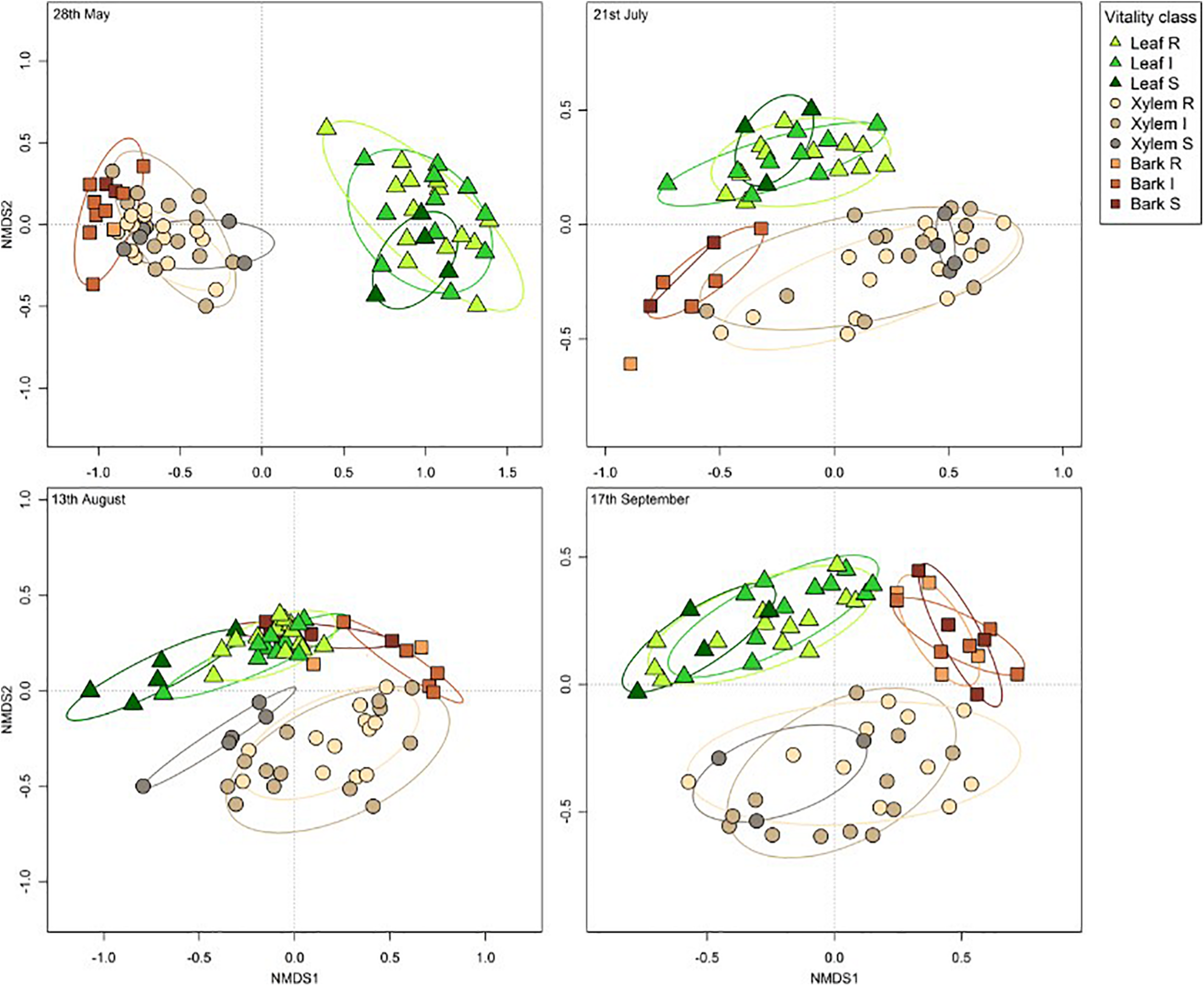 Non-metric multidimensional scaling (NMDS) ordination plots of ash fungal communities based on Bray-Curtis dissimilarity matrix. The plots are divided according to the four sampling time points: 28th May (stress value = 0.08), 21st July (stress value = 0.12), 13th August (stress value = 0.13), and 17th September (stress value = 0.14). Tissue types are represented by different shapes (leaf: triangle, xylem: circle, bark: square). Susceptibility classes are represented by intensity of colors for the gradient from Resistant (light) to Susceptible (dark).