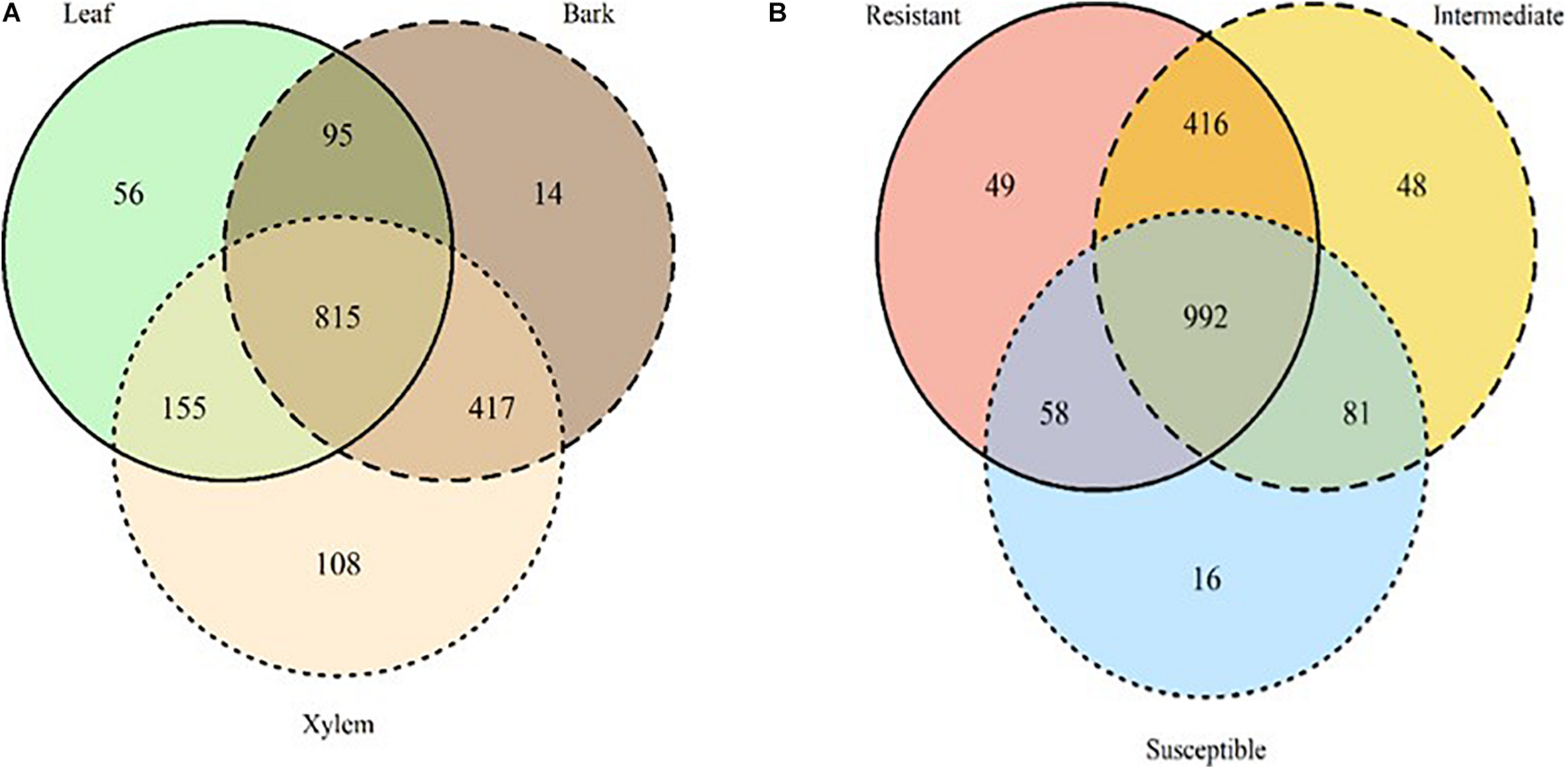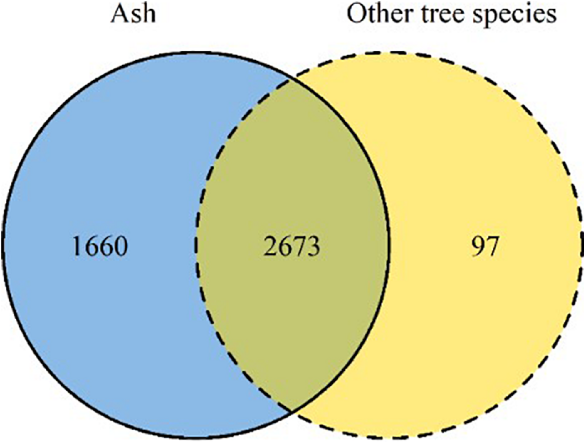 Venn diagrams were constructed to visualize the number of OTUs specific for each tree host and shared between host species. OTUs found to be exclusively associated to ash samples were also distinguished according to tissue type and susceptibility class.
