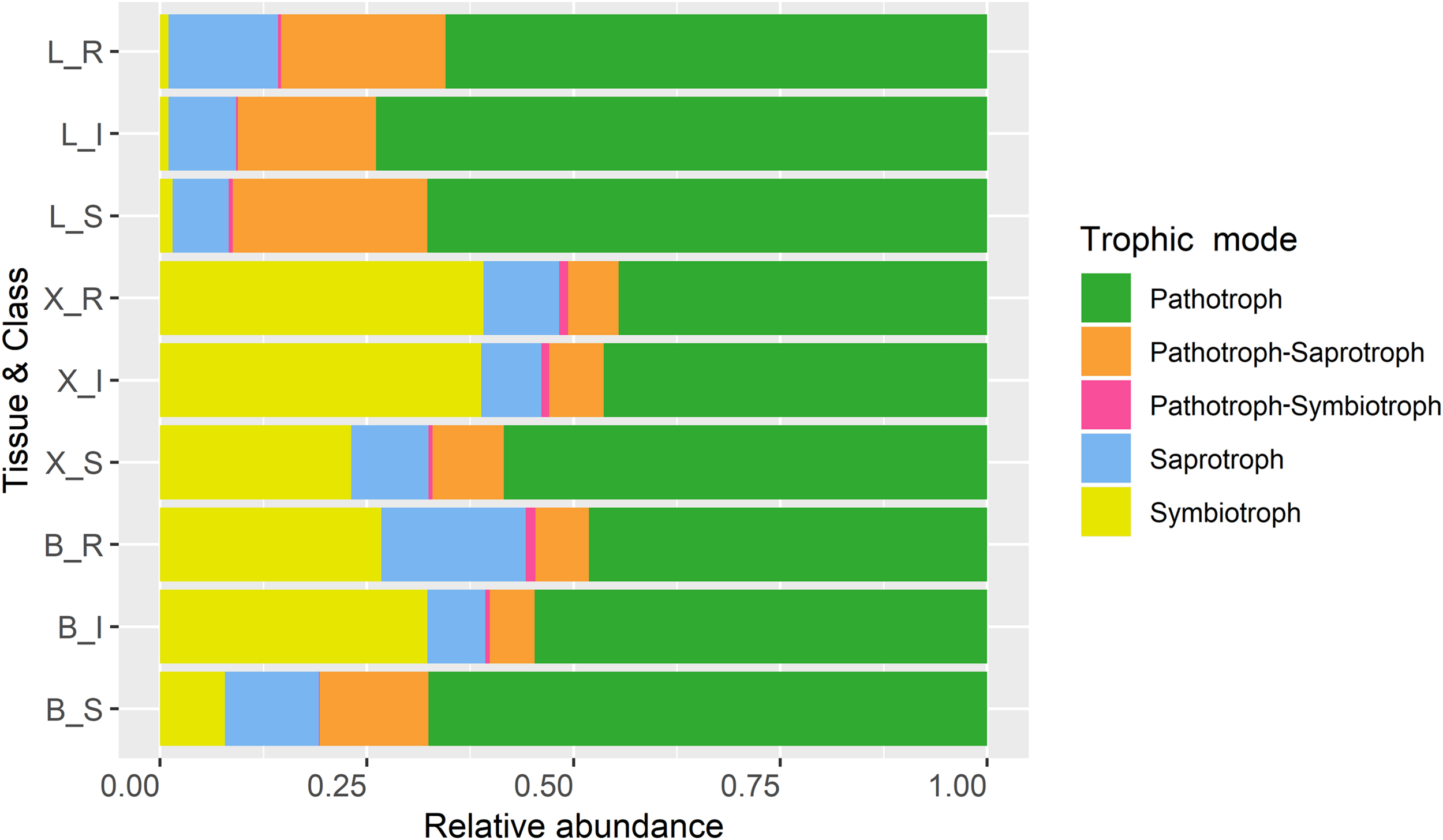 aSequence identity over the entire length of the ITS2. bPathotroph, taxon that harm host cells to obtain nutrients; Symbiotroph, taxon that exchange resources with host cells; Saprotroph, taxon that break down dead host cells to obtain nutrients; n/a. not assigned. The trophic levels were assigned via the FUNGuild software (Nguyen N. H. et al., 2016).