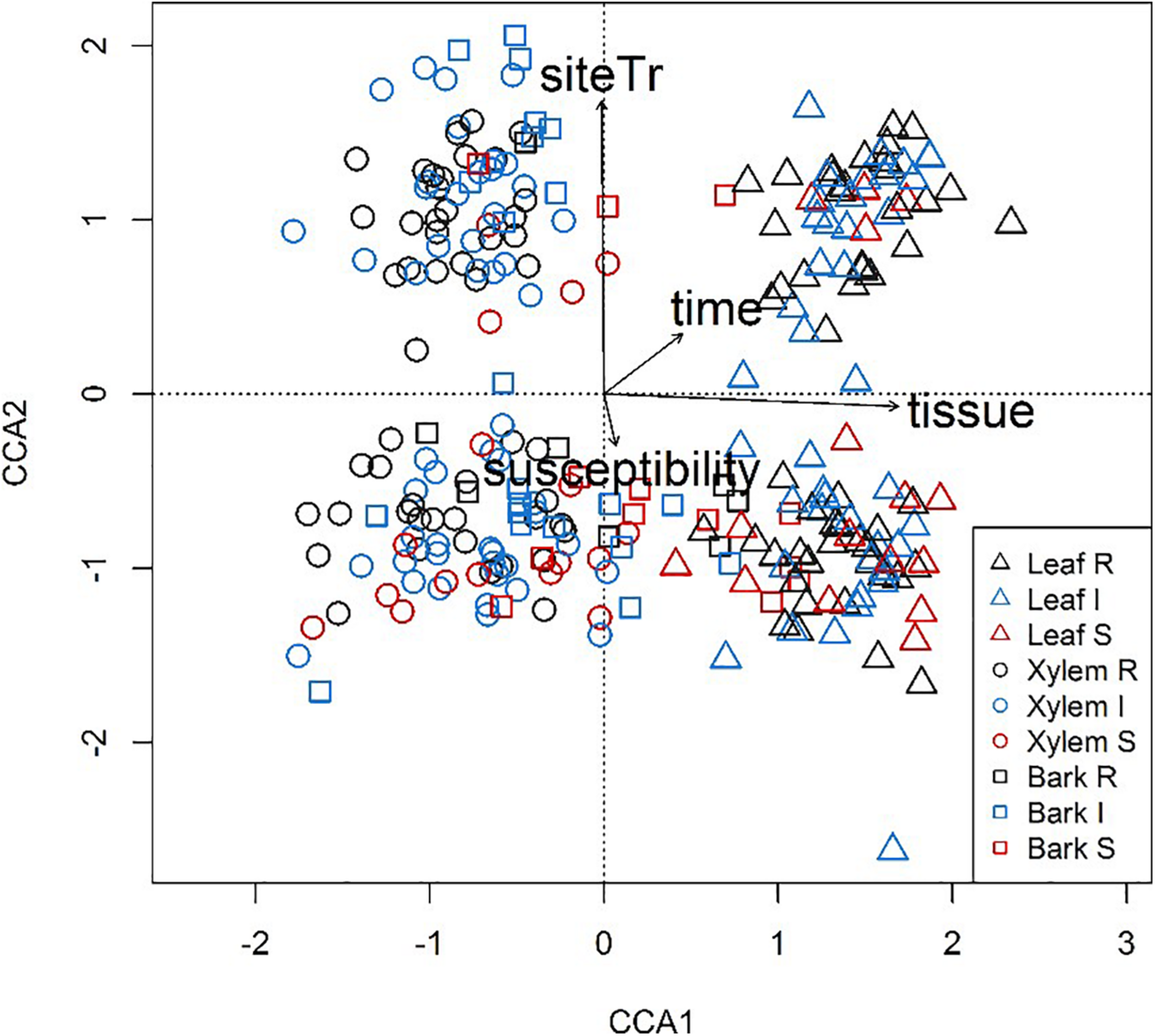To assess whether the fungal functional groups differed in relative abundance between host phenotypes within each tissue type, OTUs were classified into an ecological guilds using the FUNGuild database2 (Nguyen N. H. et al., 2016). Trophic levels defining the substrate utilization of the fungus (Nguyen N. H. et al., 2016) were assigned as either pathotroph (fungi damaging host cells), saprotroph (fungi degrading dead host cells), or symbiotroph (fungi exchanging resources with the host cells). Fungal taxa categorized into combined pathotroph-saprotroph or pathotroph-symbiotroph guilds include taxa that may exhibit different life styles depending on their life cycle stage and/or environmental conditions. Not all OTUs were associated with a trophic level, either due to limited taxonomic information for the OTU and/or trophic level association may be unknown for some fungal taxa. For those OTUs assigned to a trophic level, a canonical correspondence analysis (CCA) plot was constructed to visualize the degree of correspondence between the ash samples and the explanatory variables (i.e., tissue type, susceptibility class, time points, and site). CCA plots were then constructed for each of the three tissue types to visualize samples representing the highest read abundance for the two sampling sites (a total of 30 samples) and the tissue average. The trophic relative abundance composition of these samples was then visualized with pie charts.