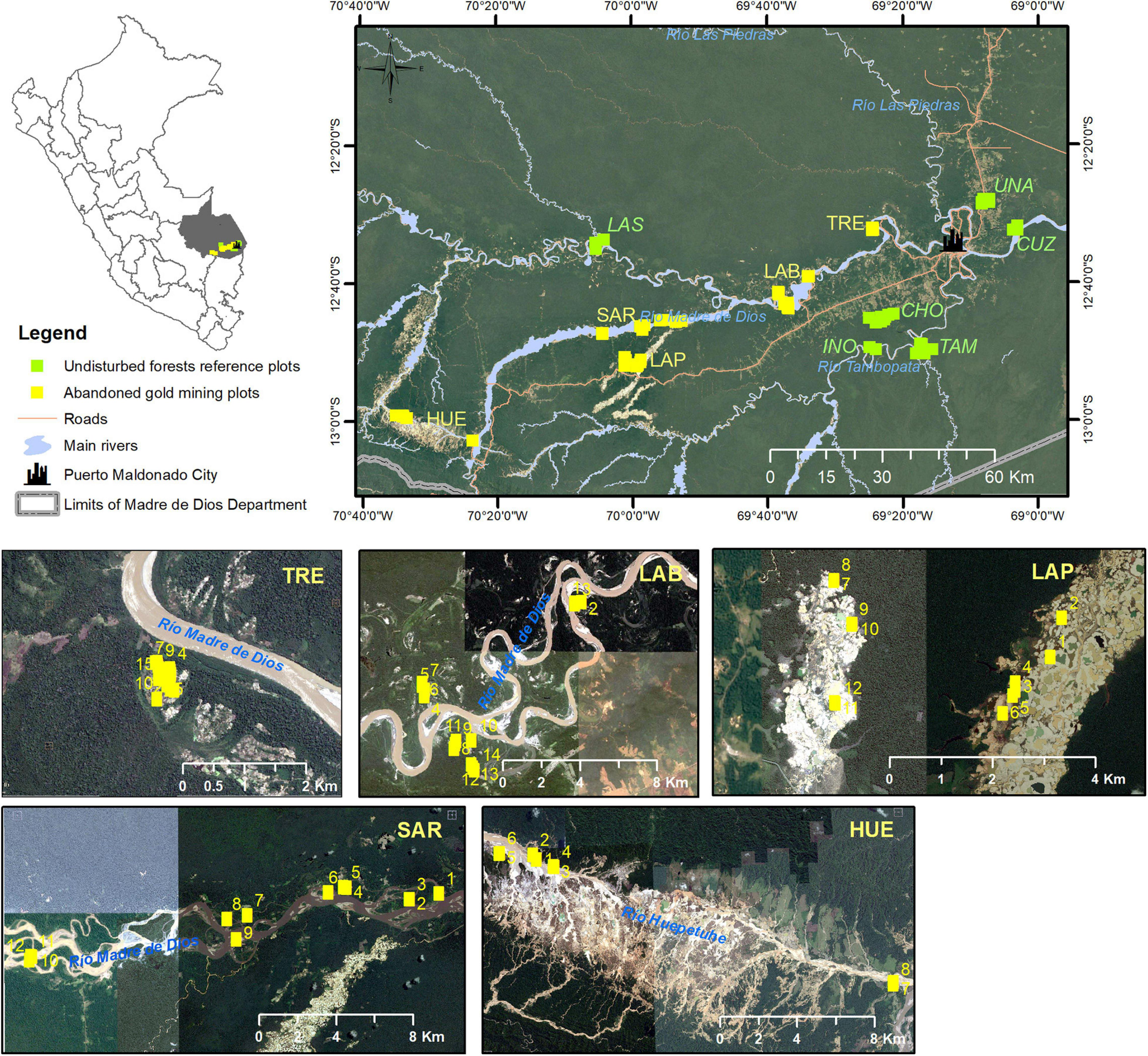 Figure 1. Location of the study region including the abandoned gold mining plots (TRE, Tres Islas; LAB, Laberinto; SAR, Sarayacu; LAP, La Pampa; HUE, Huepetuhe) and undisturbed forest reference plots (UNA, Forest of the Universidad Nacional Amazonica de Madre de Dios; INO, Inotawa; CHO, Chonta; TAM, Tambopata plot zero; LAS, Jacaralia Los Amigos; CUZ, Cuzco Amazonico). The numbers within the images indicate the plot number.