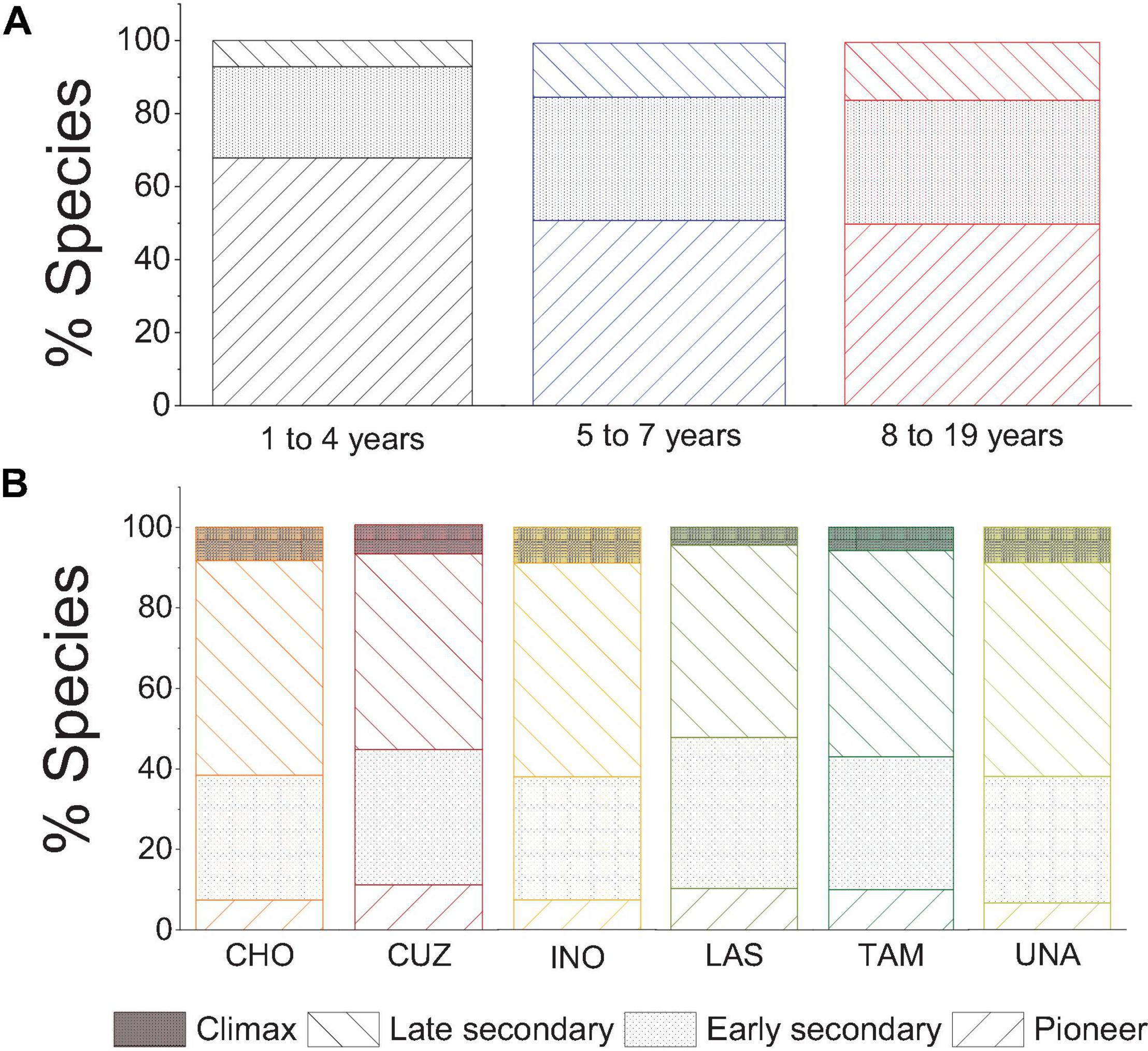 The plant community across abandoned plots was dominated by pioneer species followed by early secondary species. Late secondary species were slightly proportionally higher in plots of 8–19 years of abandonment compared with the other plot ages (Figure 3A). The plant community in reference plots was dominated by early and late secondary species and a small set of pioneer and climax species (Figure 3B).