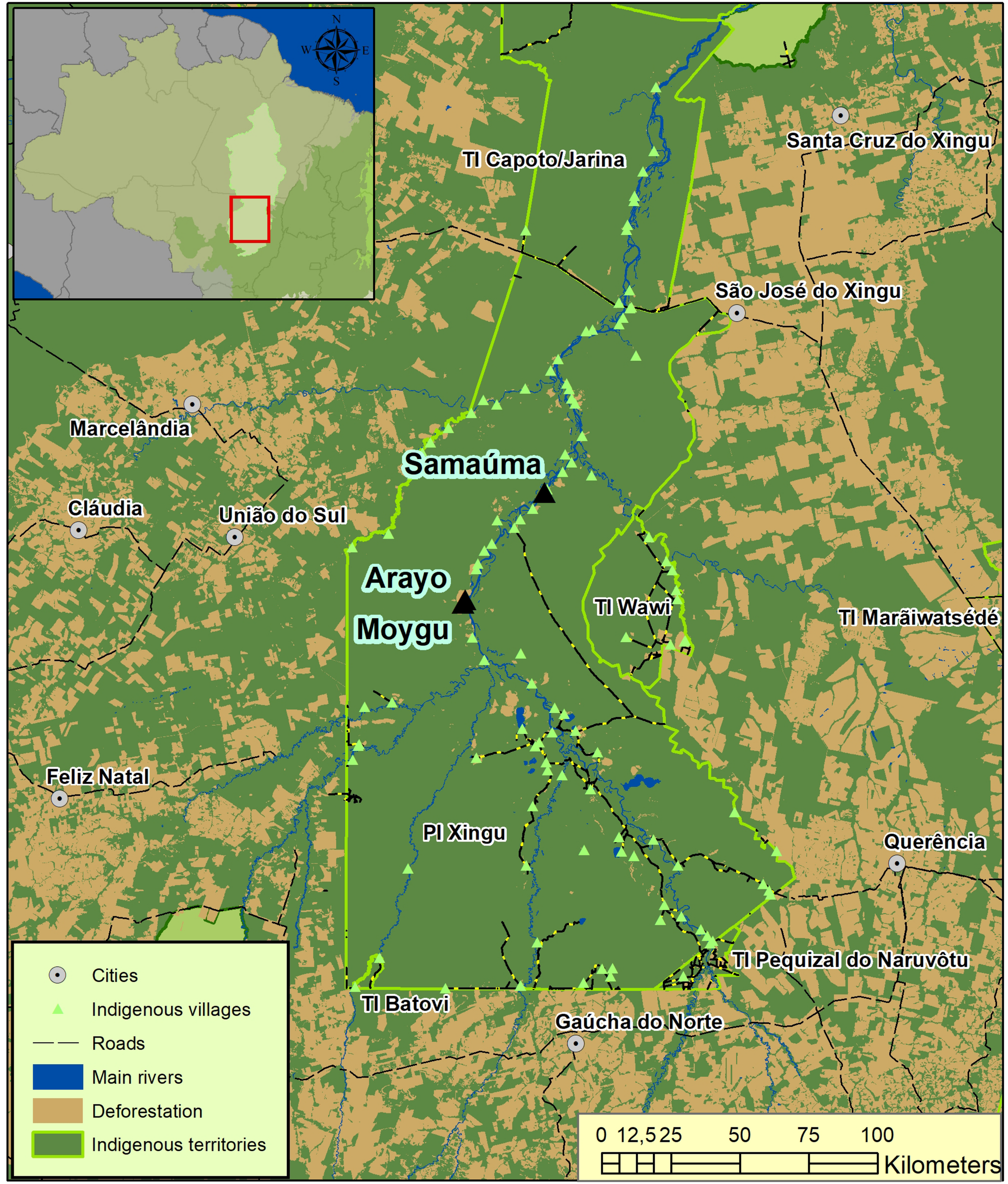Location of the Xingu River basin, and the villages of Samaúma Kawaiwete, Moygu Ikpeng, and Arayo Ikpeng within the boundaries of the TIX and surrounded by adjacent municipalities that have lost more than 66% of the forest cover in the last 40 years (map by Ricardo Abad, courtesy Instituto Socioambiental, Xingu Program).