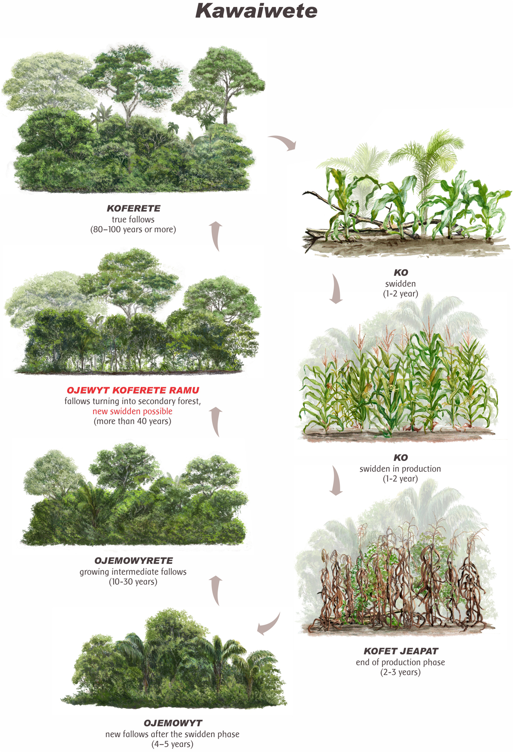 Illustration of Kawaiwete maize (Zea mays L.) shifting cultivation cycle in anthropogenic soils (ADE). When the fallow reaches the OJEWYT KOFERETE RAMU phase (in red), soils and vegetation are considered as recovered and a new cycle may start (Ilustração de Gustavo Marigo).
