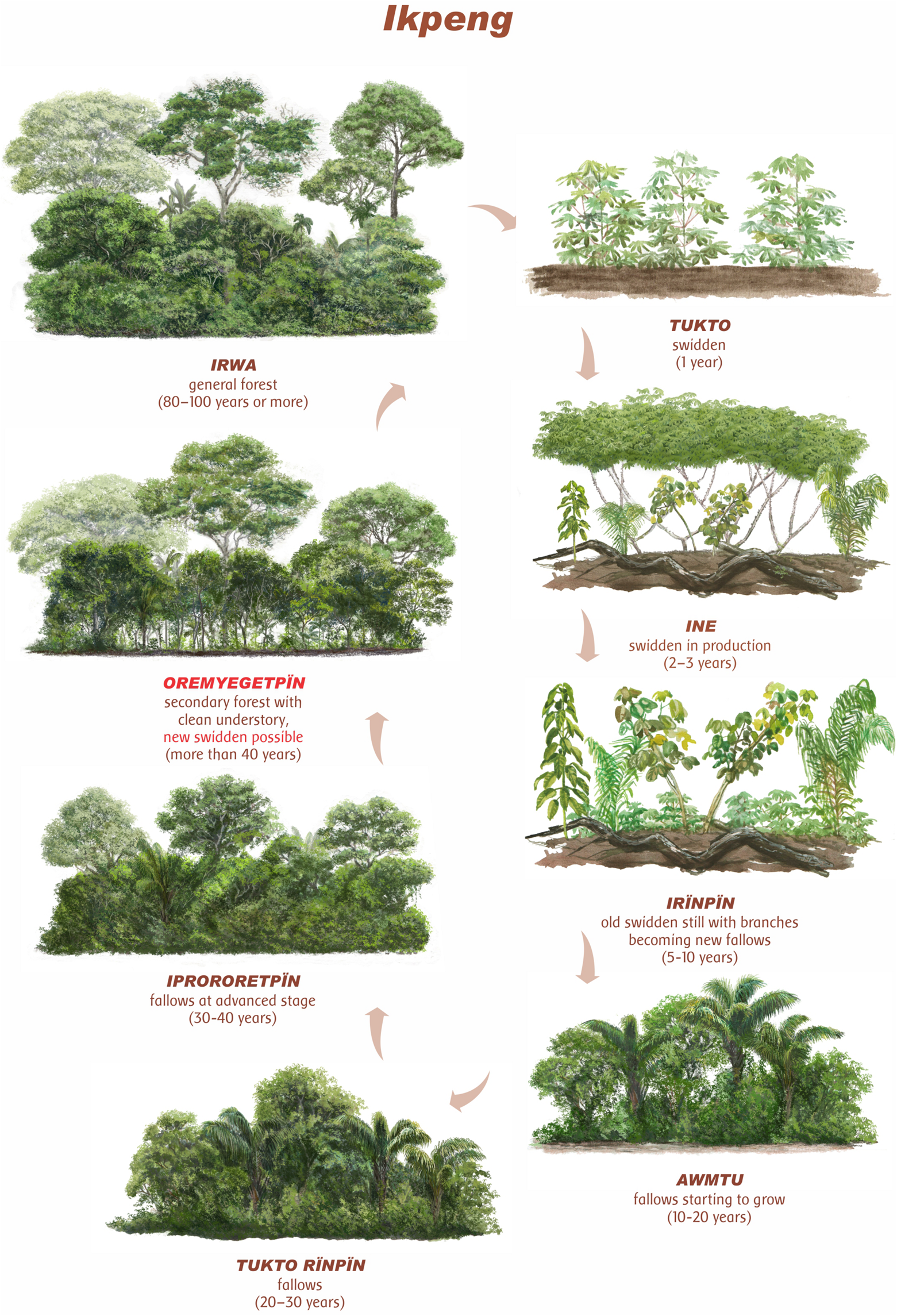 The old forests (irwa) are sought after for planting new gardens (tukto) and can be used for up to three production cycles (ine). They are managed by selective cleaning, harvesting, and replanting techniques up to the end of the cultivation stage and the beginning of the new fallow stage (irïnpïn). The initial fallow stage (3–5 years, awmtu) is followed by the fallow stage (up to approximately 15 years, tukto rïnpïn), advancing to fallow at an advanced stage of growth (15–30 years, iprororetpïn), until reaching the secondary forest stage “with a clean understory” (30 years or older, oremyegetpïn) (Figure 3).