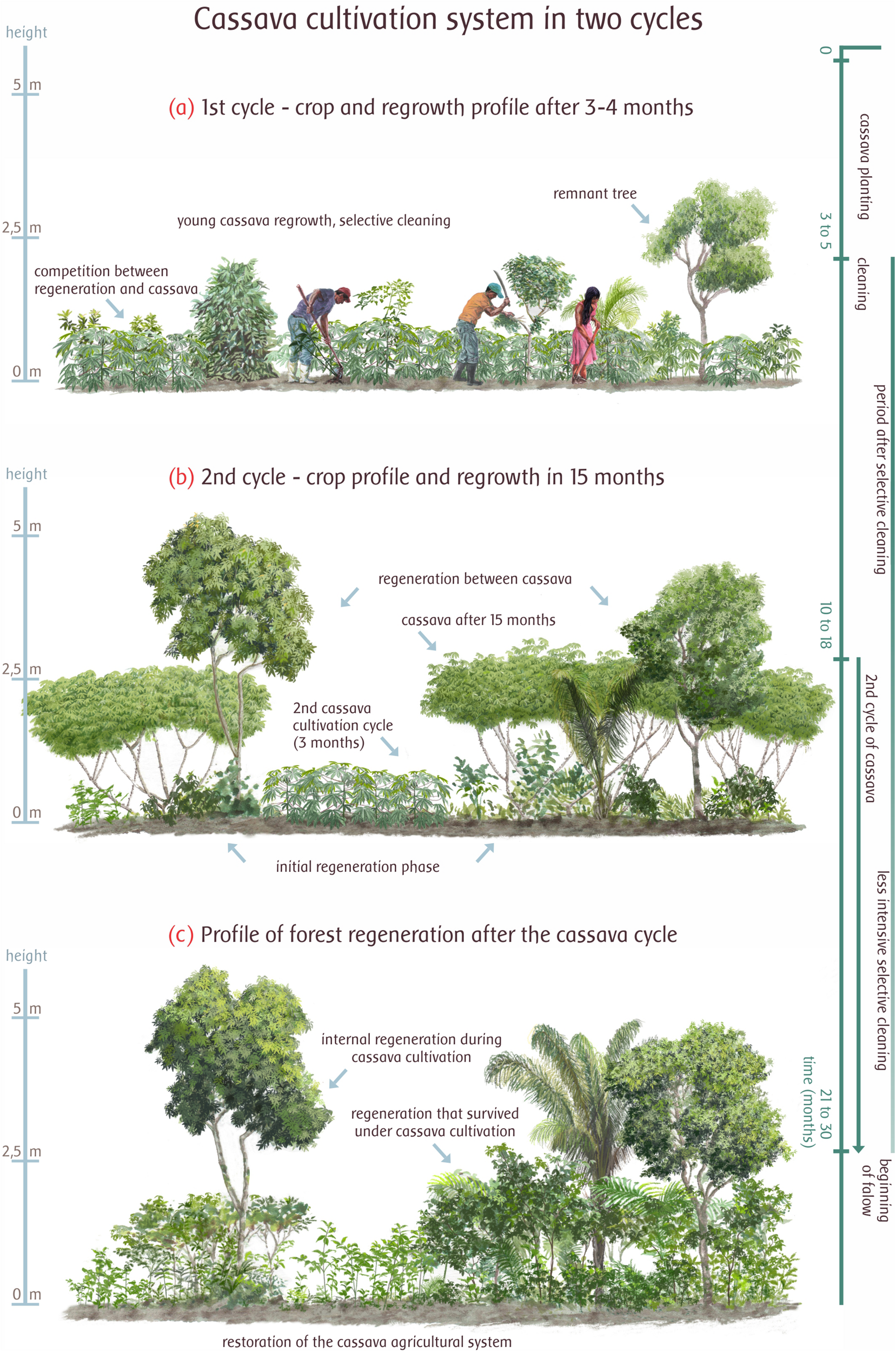 This selective cleaning system is based on two cultivation cycles, which may last between 2 and 3 years (30 months). The most intense cleanings take place in the first year, between 3 and 4 months of cassava growth. While weeding, farmers select the species that will remain in the system after selective cleaning. From the second year, the first-cycle cassava begins to be harvested and its branches are replanted taking advantage of the same location of the collected roots. At this stage, the regenerating trees that were left in the first year are already grown and can be pruned so that they do not hinder the second-cultivation cycle cassava. From the second year onward, regeneration trees are left to grow, the last cassava harvest takes place, and the regeneration phase of fallow begins with several species of trees already established.