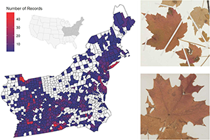 Figure 1. (Left) Map of the eastern United States with counties colored by the number of herbaria specimens of Acer rubrum or Acer saccharum collected. The inset map details the location of the sampled states (dark gray) in the greater United States. White counties indicate counties with no specimens. (Right) representative images of a specimen with colored leaves and other damage from 1915 (top) and a specimen of colored leaves with herbivore chewing damage from 1891 (bottom).