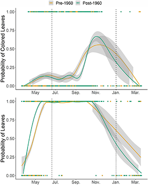 Plot of the probability of a given specimen collected on a particular day of year containing colored leaves (top) or leaves (bottom). Points are colored by whether the specimen was collected prior to 1960 or after 1960, and lines are LOWESS best fit curves with a shaded area showing 95% confidence intervals. The vertical dashed line is at the approximate summer solstice (day of year 115). To prevent circularity in the analyses, we shifted all dates prior to the approximate spring equinox (day of year 79) to the end of the year by adding 365 days, so the dotted vertical line marks the new location of January 1st. Data were not analyzed as pre- and post-1960 but are graphed as such to visualize shifts in phenology over the time period.