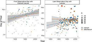 Scatter plots of the first day of year between the approximate summer and approximate fall solstice when a specimen was recorded with colored leaves (left) and the last day of year from the spring equinox to the spring equinox of the following year when a specimen was recorded with leaves (right). Points are colored by the species and sized by the number of specimens collected during that period. Lines are best fit linear regressions with a shaded area indicating the 95% confidence interval and are fit independently to each species.