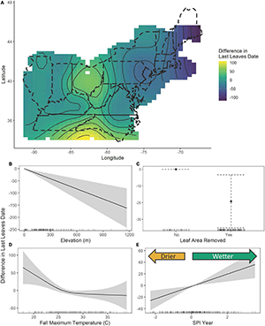 Figure 4. The estimated contributions of latitude and longitude (A), elevation (B), leaf area removed (C), maximum fall temperatures (D), and the SPI of the year of collection (E) from the general additive model of the last date with preserved leaves. In figure (A), the dashed lines show the United States state boundaries in the included regions, while the solid lines show the fitted smoothed curves output from the GAMs overlaid with the fitted contour showing spatial differences in last leaf dates. In figures (B,D,E) the solid curve while the gray regions or dotted whiskers represent the 95% confidence interval and in figure (C) the solid point shows the estimated contribution while the dotted lines show the 95% confidence interval. Tick marks along the x-axis indicate the density of specimens.