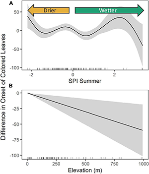 The estimated contributions of the Summer SPI (A) and the elevation (B) for the General Additive Model of onset of colored leaves. The solid curve is the estimated contribution while the gray regions represent the 95% confidence interval, tick marks along the x-axis indicate the density of specimens.