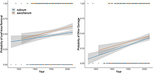Before testing more comprehensive models, we used simple linear regressions to identify shifts in the timing of the last date with recorded leaves over time and the first date with recorded colored leaves over time. Because presence/absence outcome variables are binary, we used logistic regressions to assess changes in the presence/absence of damage categories and colored leaves in specimen records over time. These less complex models provide baseline estimates of changes in these phenomena over time, prior to accounting for climate-related or spatial variability.