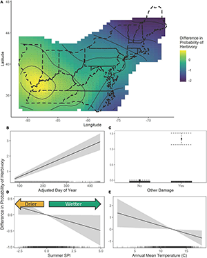The estimated contributions of latitude and longitude (A), elevation (B), leaf area removed (C), maximum fall temperatures (D), and the SPI of the year of collection (E) from the general additive model of the last date with preserved leaves. In figure (A), the dashed lines show the United States state boundaries in the included regions, while the solid lines show the fitted smoothed curves output from the GAMs overlaid with the fitted contour showing spatial differences in last leaf dates. In figures (B,D,E) the solid curve while the gray regions or dotted whiskers represent the 95% confidence interval and in figure (C) the solid point shows the estimated contribution while the dotted lines show the 95% confidence interval. Tick marks along the x-axis indicate the density of specimens.