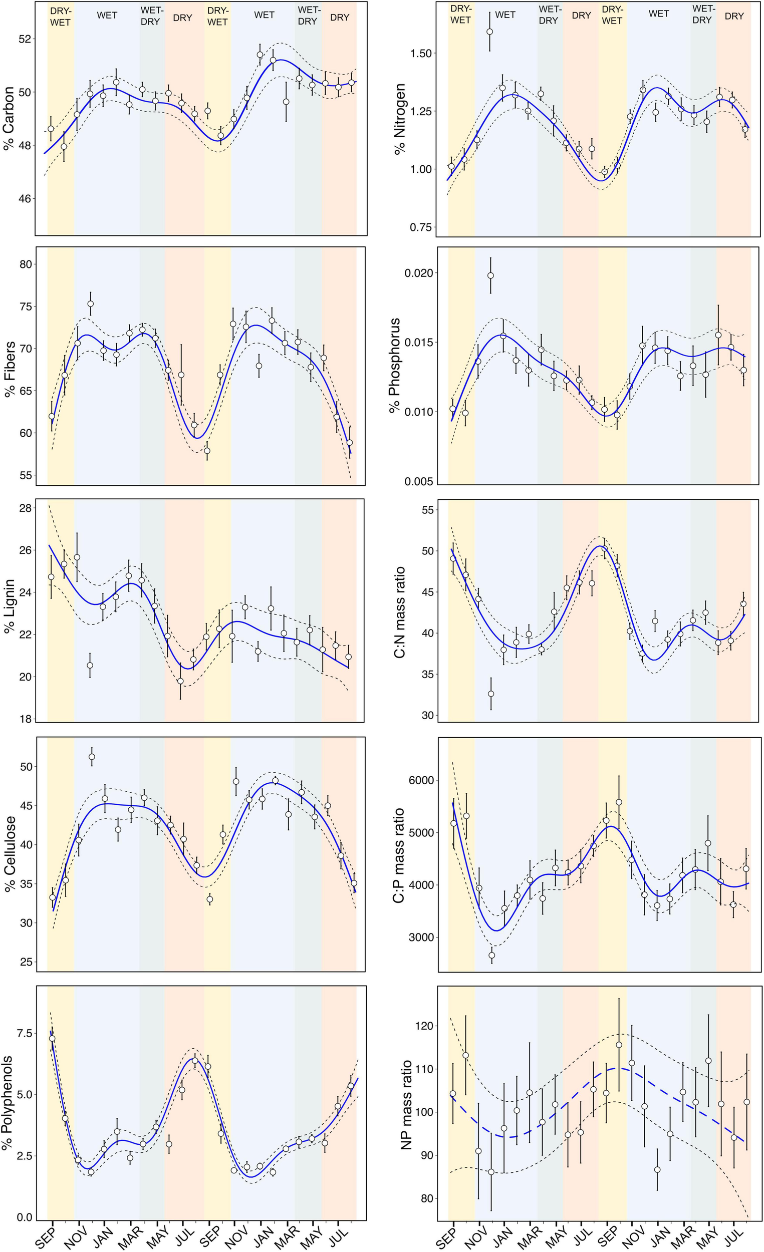 Figure 2. Temporal patterns of litter traits as concentrations of each compound and, ratios of C:N, C:P, and N:P across the four seasons (dry-wet, wet, wet-dry, and dry seasons) over 2 years. Blue lines represent the non-linear temporal trend from generalized additive mixed models and dashed lines the 95% confidence intervals of the models. Circles are means and vertical lines denote upper and lower limits of standard errors from data of multiple sampling sites within streams.