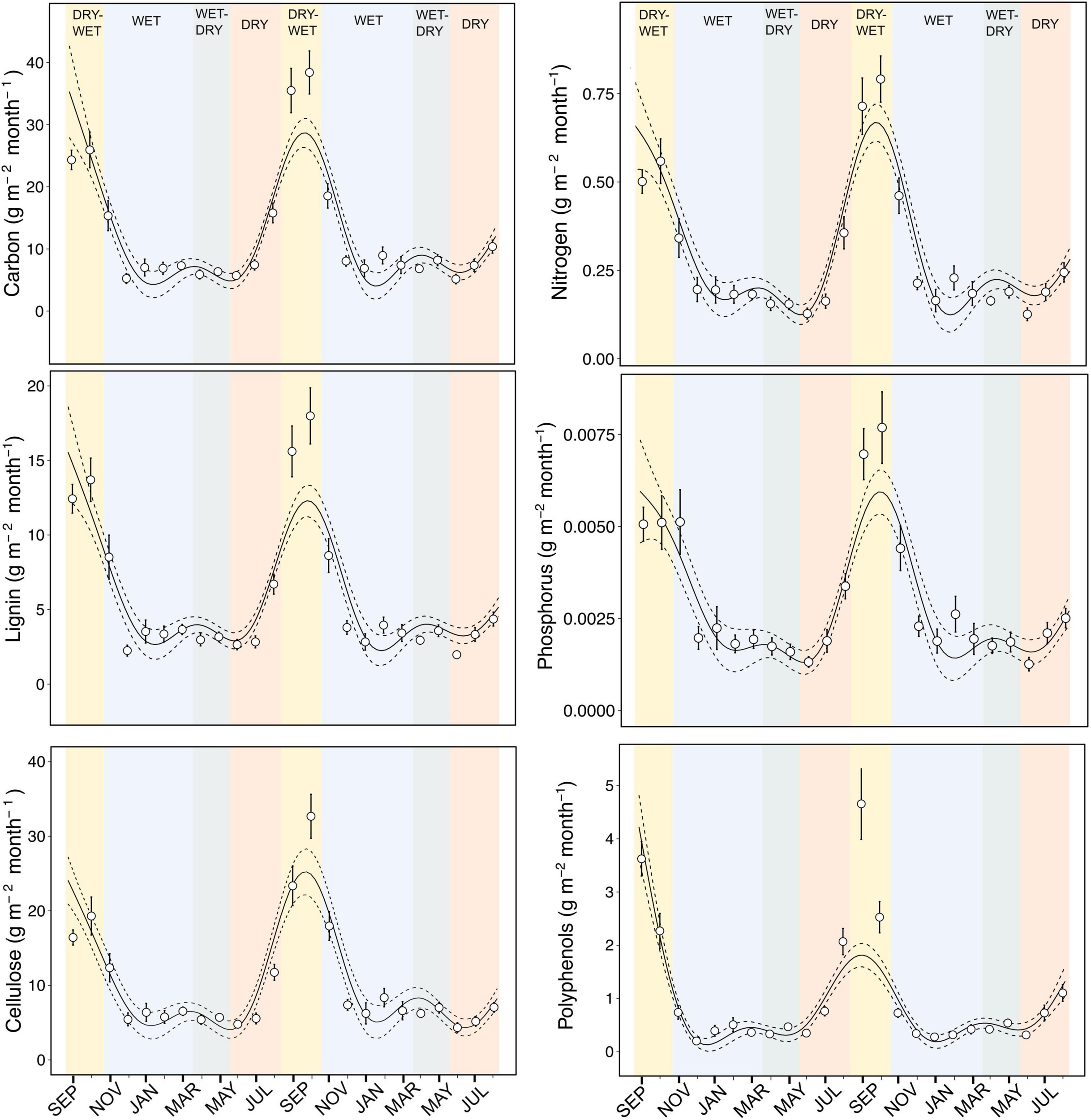 Figure 3. Temporal patterns of litter traits as the mass of each compound (g m– 2 month– 1) across the four seasons (dry-wet, wet, wet-dry, and dry seasons) over 2 years. Solid lines represent the non-linear temporal trend from generalized additive mixed models and dashed lines the 95% confidence intervals of the models. Circles are means and vertical lines denote upper and lower limits of standard errors from data of multiple sampling sites within streams.
