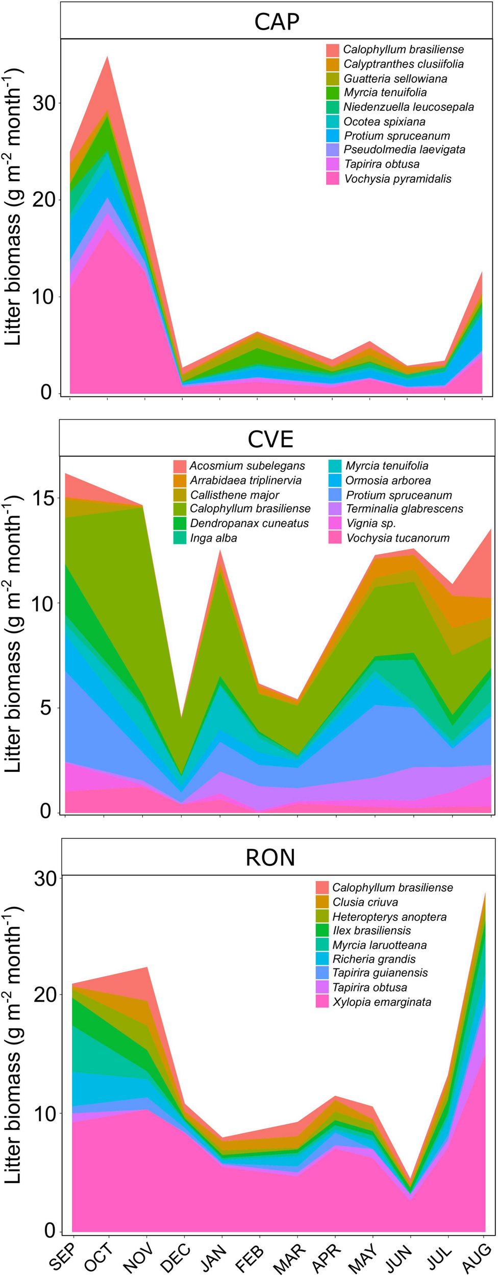 Litterfall entering the three streams and across the four seasons was comprised of 142 plant species (85 species at CVE, 84 at CAP and 39 at RON stream). However, 64–74% of species (or 25–63 species) contributed less than 1% of annual litterfall biomass. As a result, 9–12 species dominated litter phenological patterns and were responsible for more than 70% of annual litter biomass (Figure 4 and Supplementary Figure 1). Although some of the dominant species contributed at certain periods of the year, others were present year-round (e.g., Vochysia pyramidalis, Protium spruceanum, Calophyllum brasiliense, Xylopia emarginata) (Figure 4). Dominant species or genus that were found in the three riparian ecosystems showed similar litterfall patterns as supported by Calophyllum brasiliense and Myrcia (Figure 4).