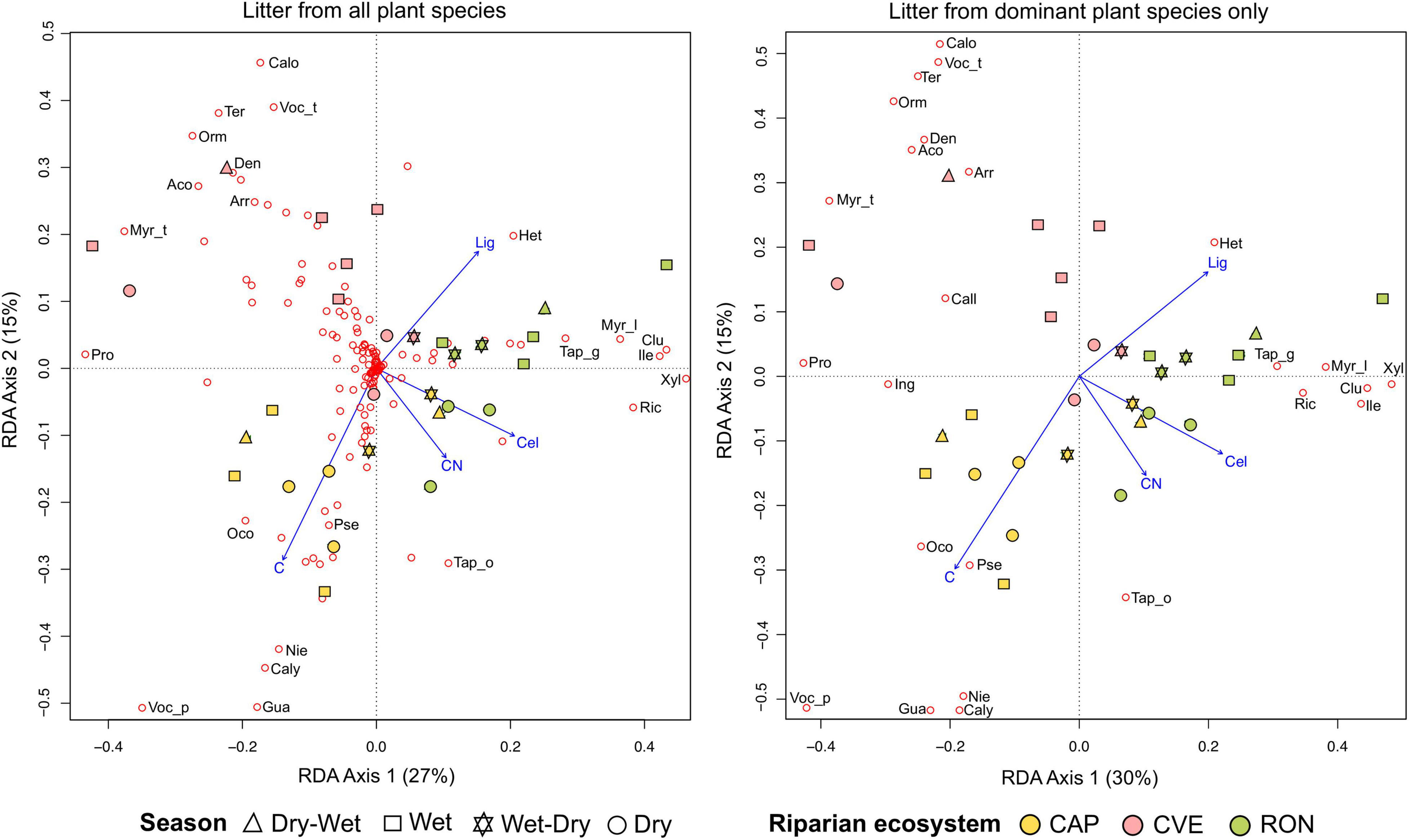 Figure 5. Biplot ordinations of redundancy analyses (RDA) exploring the congruence between plant species composition of litterfall and litter chemical traits. Four non-colinear traits summarizing the chemical variation of litter were used in both RDA analyses (i.e., carbon, C:N, cellulose and lignin). Species data are shown with non-filled red circles. Species acronyms are shown only for the dominant species. Acronyms are the three initial letters of each species (or four letters if a genus represent more than one species) described in Figure 4.