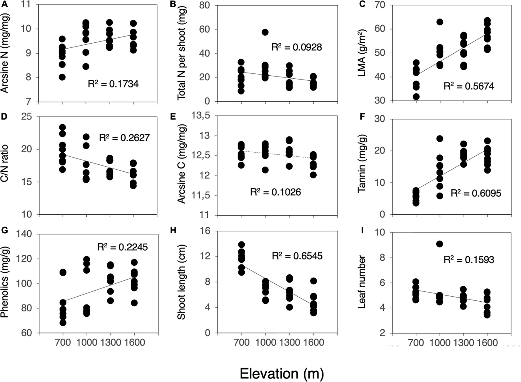 Correlation between plant characteristics (leaf traits and plant growth) and elevation (n = 32). (A) N, (B) Total N per shoot, (C) LMA, (D) C/N ratio, (E) C, (F) Condensed tannin, (G) Total phenolics, (H) Shoot length, and (I) Number of leaves per shoot. The y-axis in (A,E) shows arcsine (n)-transformed N and C contents. Solid lines denote significant correlation, and dashed lines denote marginal significant correlation.