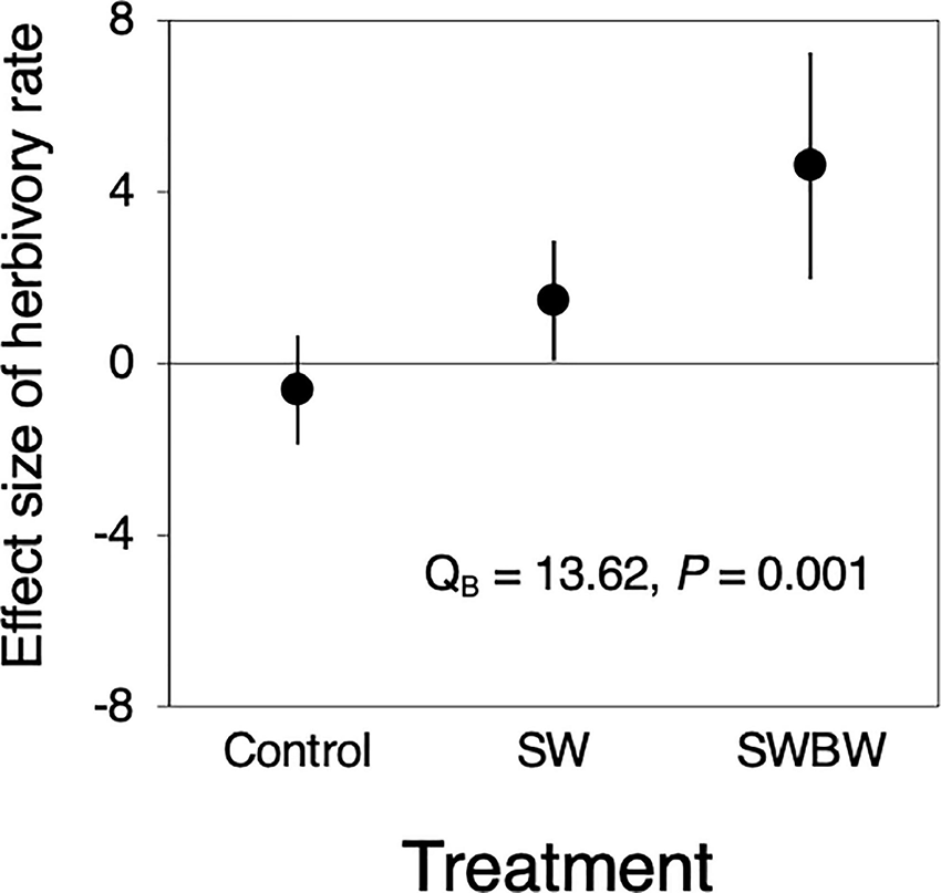 Significant differences in the effect size of temporal variation in herbivory were observed among the treatments (QB = 13.62, P = 0.001, Figure 3). The herbivory in control trees did not differ between 2010 and 2012 (before and after the warming experiment), whereas that in SW and SWBW trees increased (SW: 1.464, 95% CI: 0.068–2.860; SWBW: 4.601, 95% CI: 1.955–7.248). SWBW exhibited a stronger positive effect on herbivory than did SW alone.