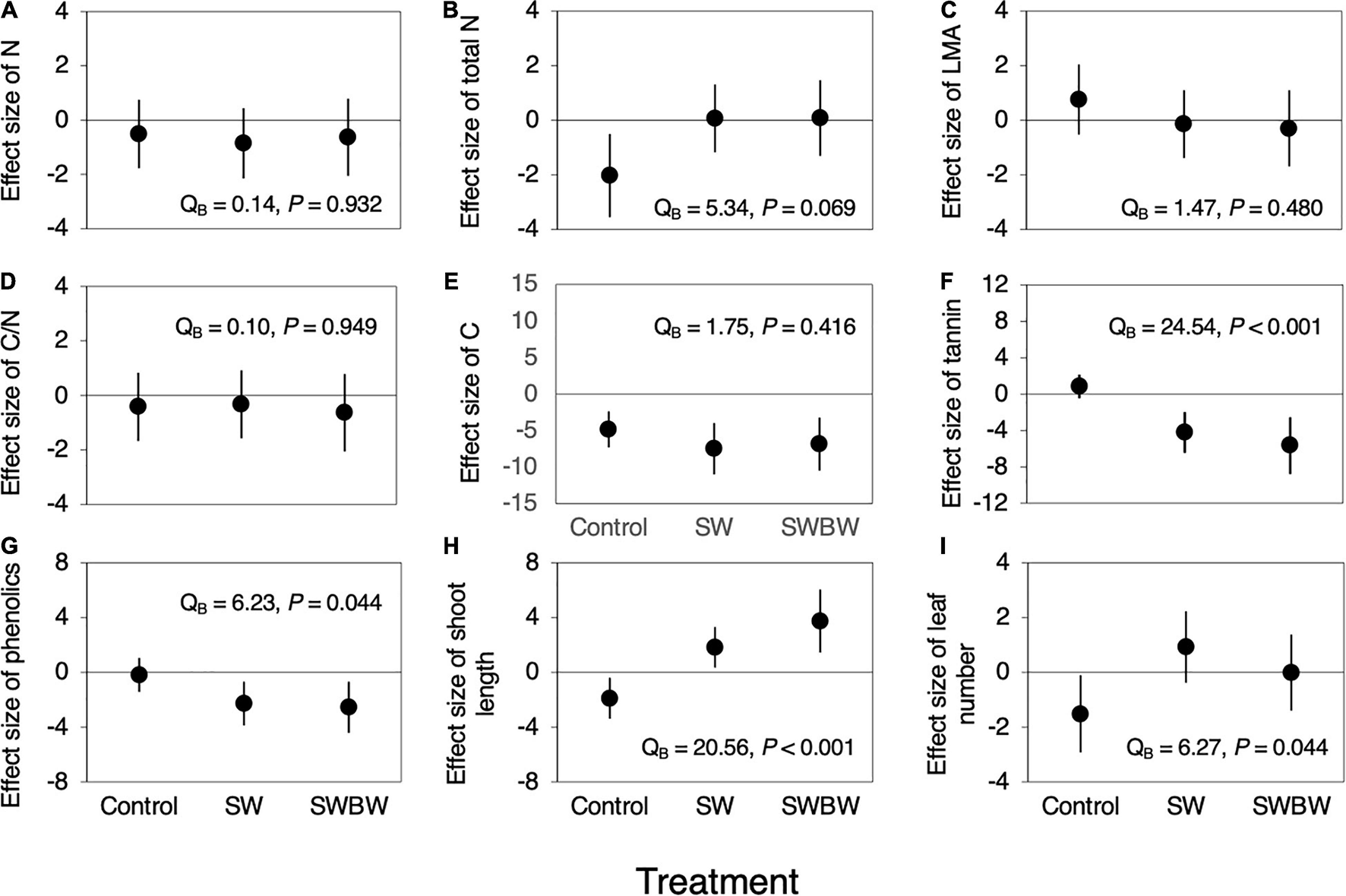 Effect sizes (Cohen’s d) of temporal variation (between 2010 and 2012) in leaf traits and plant growth characteristics in control trees (Control, n = 5), the soil-warmed trees (SW, n = 5), and soil and canopy branch-warmed trees (SWBW, n = 4). (A) N, (B) Total N per shoot, (C) LMA, (D) CN ratio, (E) C, (F) Condensed tannin, (G) Total phenolics, (H) Shoot growth, and (I) Number of leaves per shoot. Positive effect size indicates that leaf traits and plant growth characteristics increased from 2010 to 2012 (before and after the warming experiment). Each dot indicates mean effect size. Each vertical line denotes 95% confidence interval (CI). The effect is significant if the 95% CI does not include zero. Significant QB value indicates between-treatment heterogeneity.