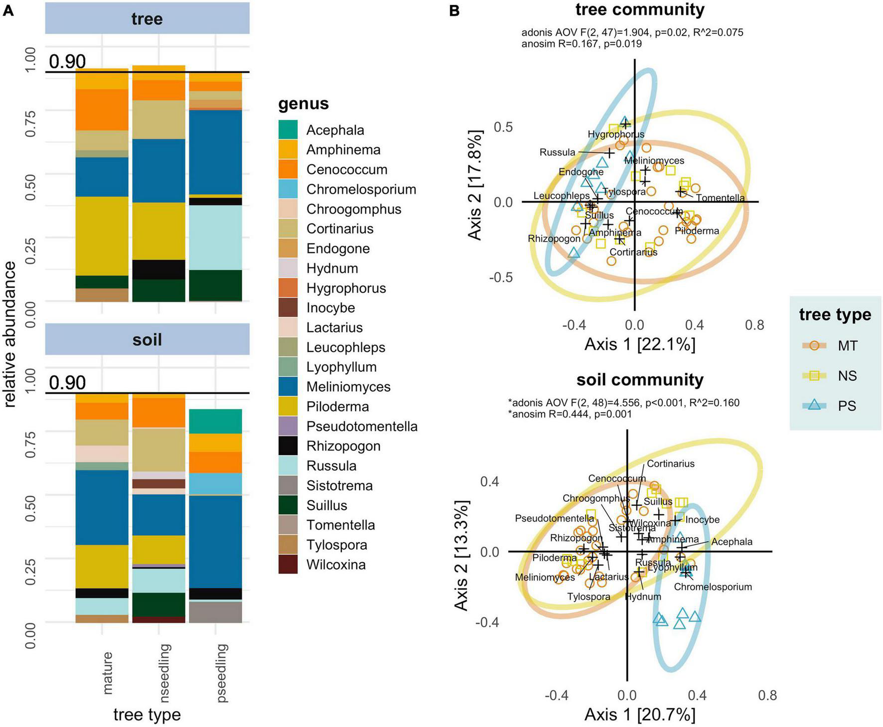 Compositional differences between tree types in ectomycorrhizal fungal communities associated with whitebark pine in interior British Columbia separated by sample type. Sample type: ectomycorrhizae samples (tree OR tree community) and soil samples (soil OR soil community). Tree types: mature trees (mature OR MT), naturally regenerated seedlings (nseedling OR NS) and planted seedlings (pseedling OR PS). (A) Relative abundance (proportion of reads after rarfying) of the genera making up > 0.9 of the total abundance in each tree type. (B) Principal Coordinate Analysis (PCoA) biplot ordinations based off a Bray-Curtis distance matrix. Axes show the percent of variation in community composition explained. Samples are marked as colored points; genera are added as weighted scores and marked as black crosses. Results of Adonis and ANOSIM statistics testing tree type as predictor of composition are displayed in top line. *A significant dispersion effect was detected in the soil community that could have effected these statistics.