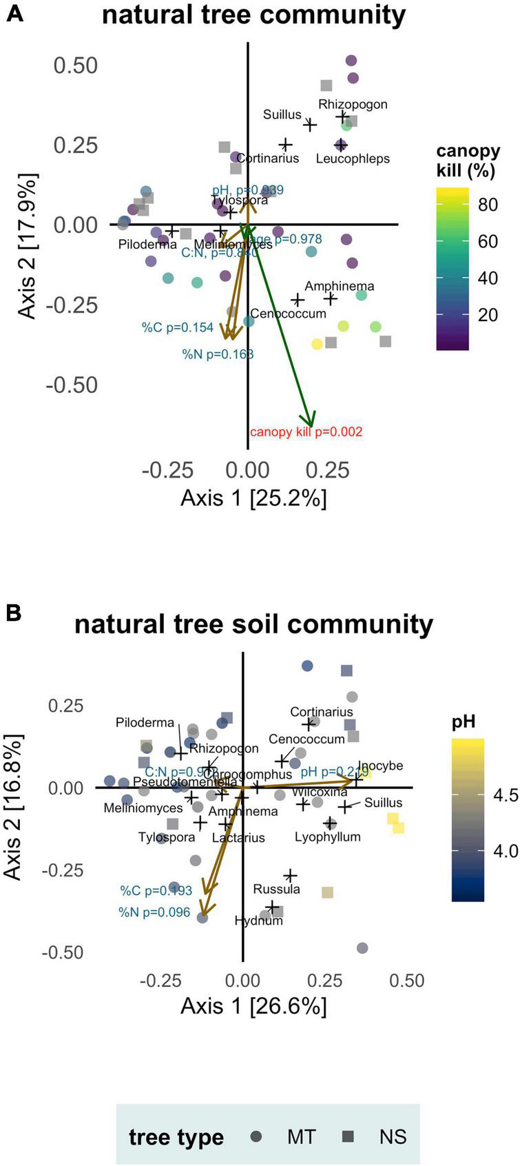 Soil conditions (pH, %N, %C, C:N), tree age and canopy kill as predictors of ectomycorrhizal fungal communities associated with naturally occurring whitebark pine separated by sample type: (A) mycorrhizae samples (tree community) and (B) soil samples (soil community). Tree type: mature trees (MT) and naturally regenerated seedlings (NS). Principal Coordinate Analysis biplot ordinations based off a Bray-Cutis distance matrix. Axes labels indicate percent of variation in community composition explained. Samples are marked as colored points; genera are added as weighted scores and marked as black crosses. Vectors representing soil variables are drawn in brown and vectors representing tree age and canopy kill are drawn in green. Length of the vector is proportional to its correlation with community composition; significant predictors (canopy kill) are marked with red.