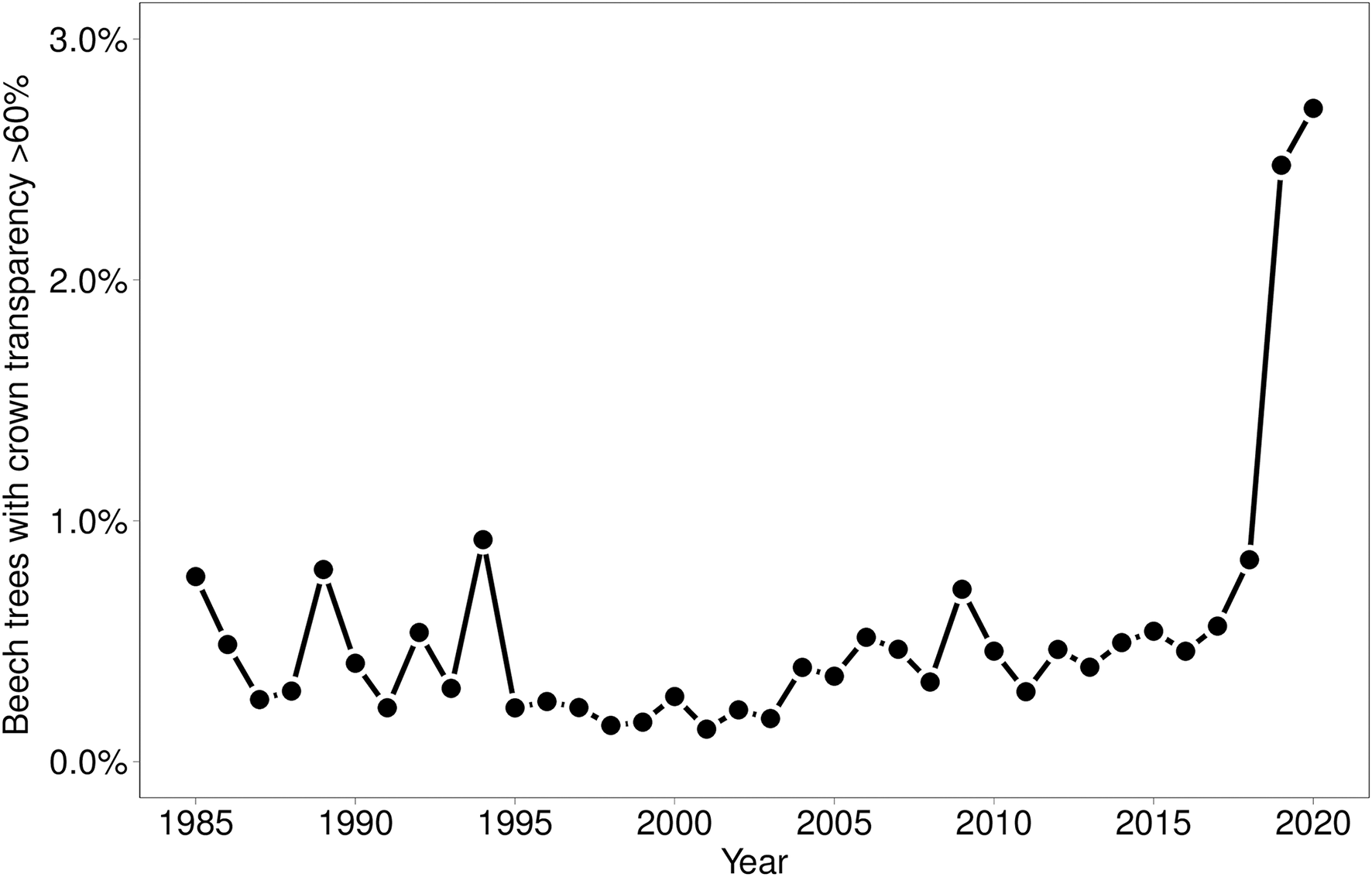 Proportion of Fagus sylvatica with a crown transparency of >60%.