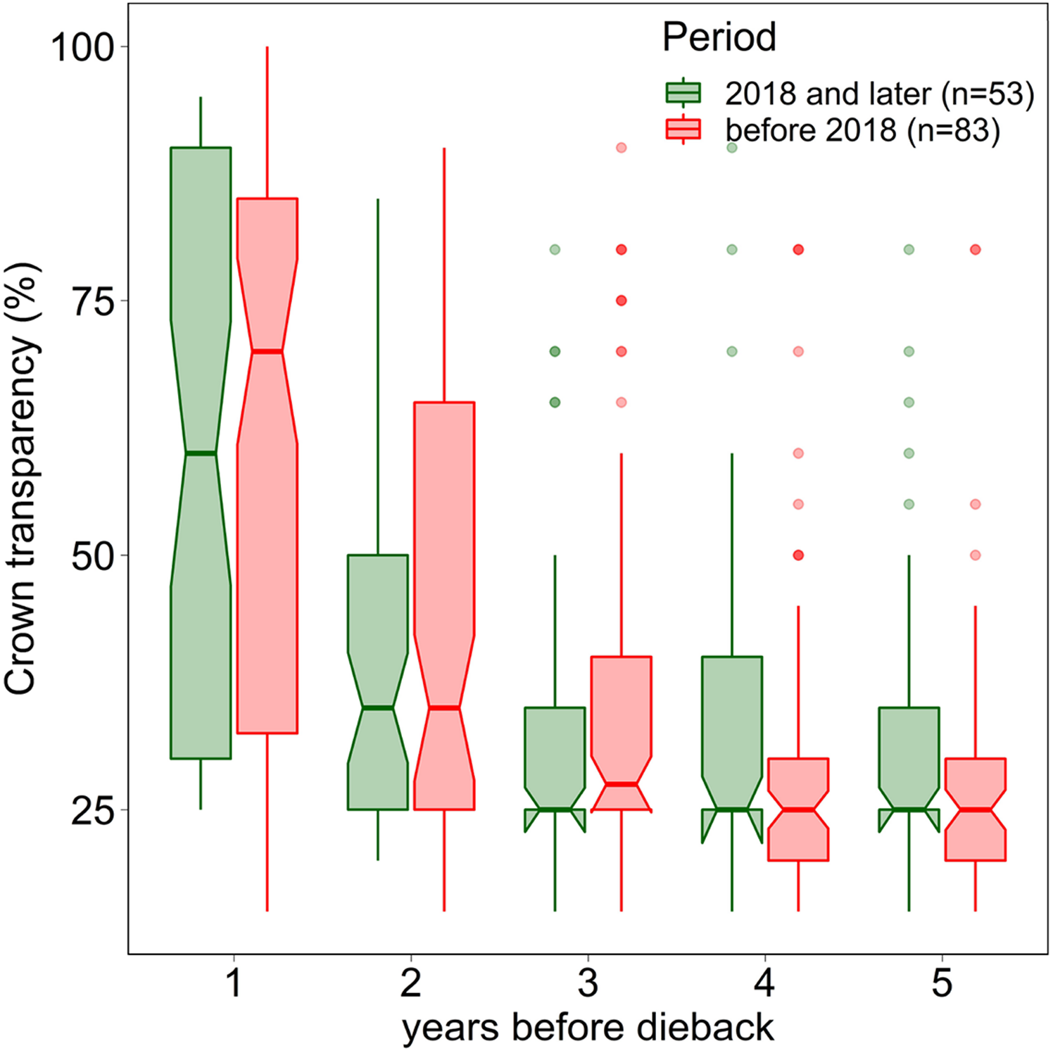 Crown transparency of beech in the years before dieback before 2018 (1984–2017) and in the years 2018, 2019, and 2020. Notches indicate a 95% confidence interval.