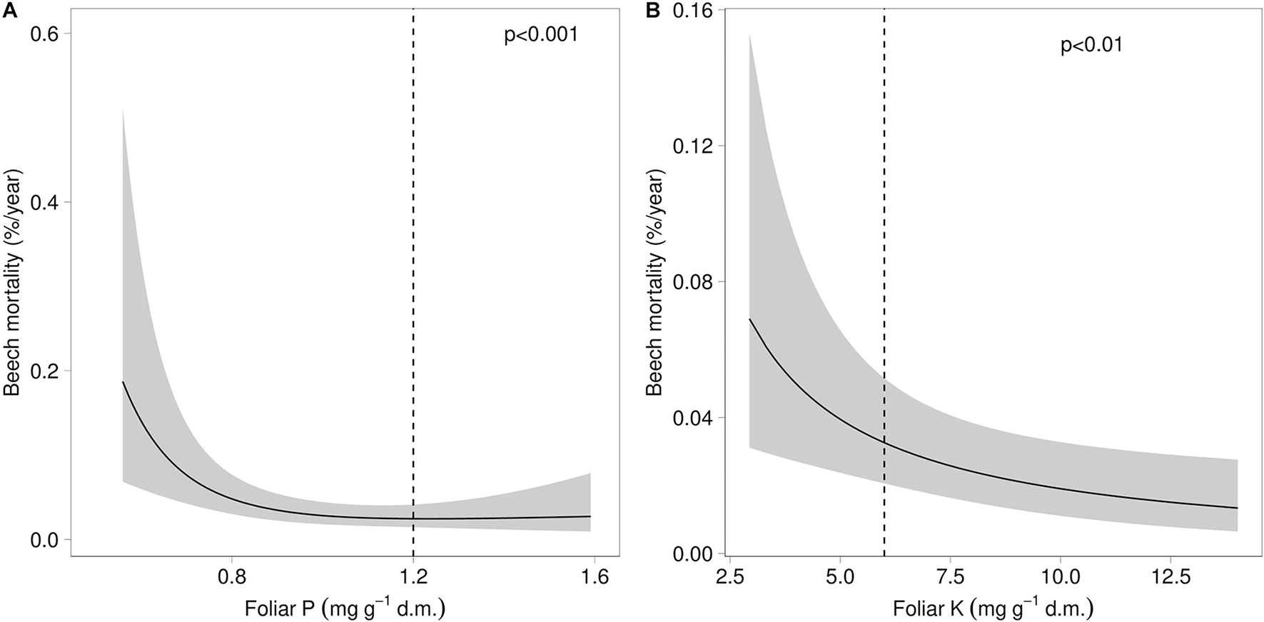 Relation between beech mortality and the concentration of phosphorus (A) and the concentration of potassium (B) in beech leaves. The dashed lines indicate the lower threshold value for normal nutrition according to Göttlein (2016).