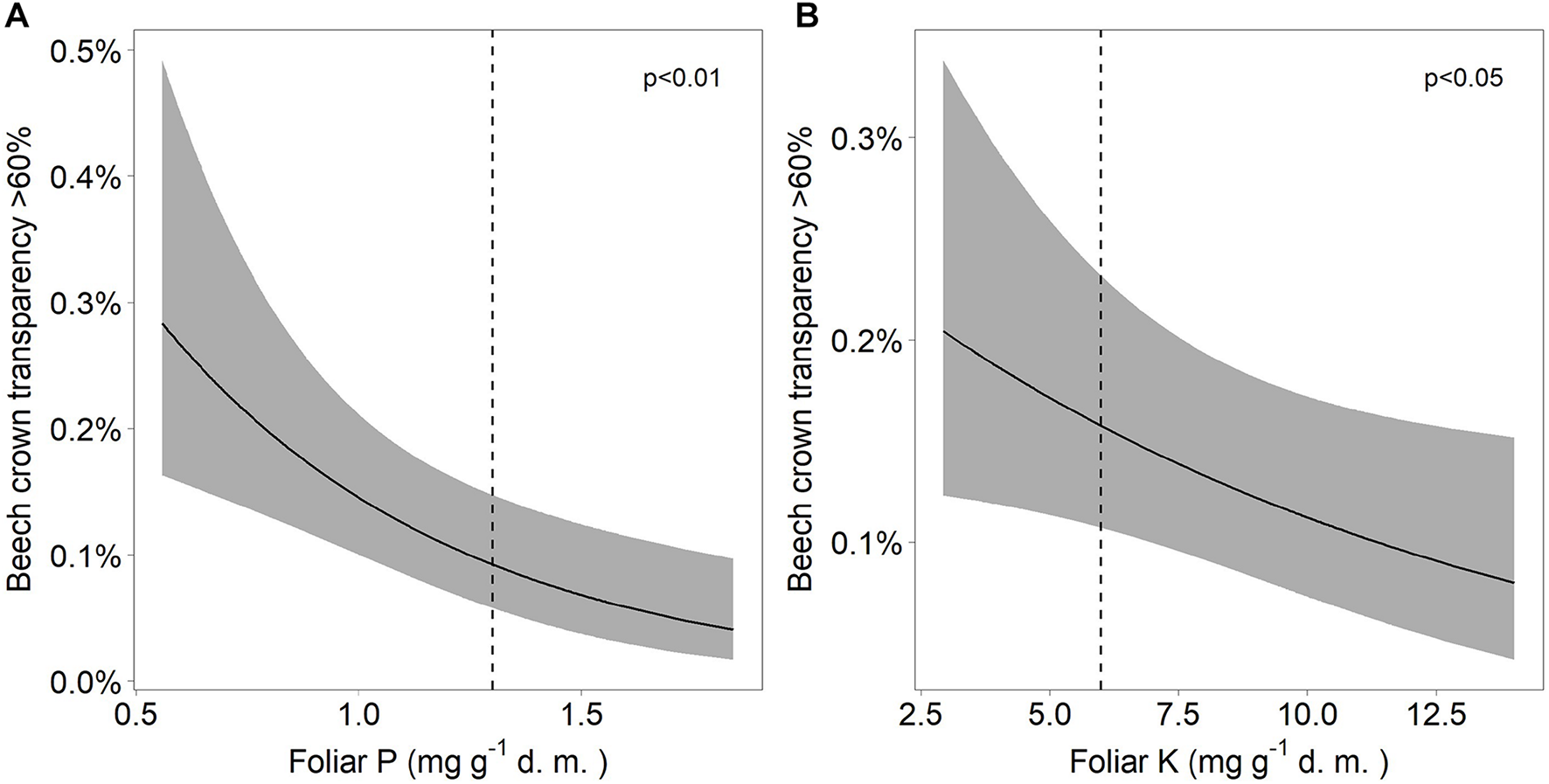 Relation between severe beech crown transparency and (A) the concentration of phosphorus (A) as well as the concentration of potassium (B). The dashed lines indicate the lower threshold values for normal nutrition according to Göttlein (2016).